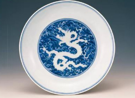 这件青花瓷盘中心有一条暗花五趾白龙,外壁上有两条小龙做追逐戏耍的姿态。龙是中国最大的神物,古人认为它是最高的祥瑞。因而龙纹仅用于宫廷及祭祀,民间不可滥用。这件瓷盘就是明代宣德时期典型的官窑器代表作之一。