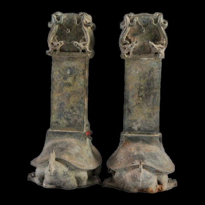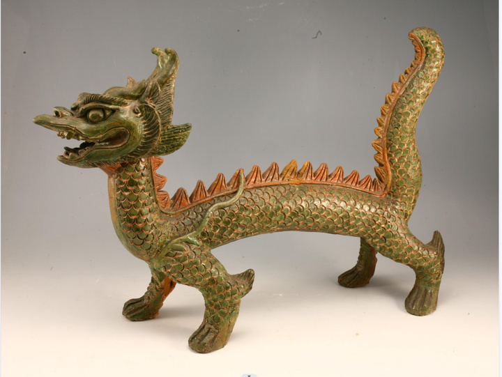 青龙为东方之神。此龙张口怒目,四肢粗壮有力,足为五爪,龙尾向上,足部及耳后皆有鳍,龙体刻麟甲。身首施绿色琉璃釉,脊鳍黄色琉璃釉,可能为宜兴窑产品。