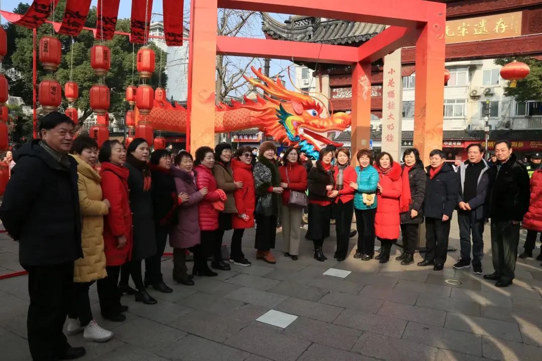 大年初一9时,一名身着汉服的宣令使从塘桥出发,敲响铜锣,穿梭在七宝老街的一条条小巷,召唤邻居们走出家门,前往钟楼广场参加以“龙舞祥瑞·七宝聚福”为主题新春游园会。