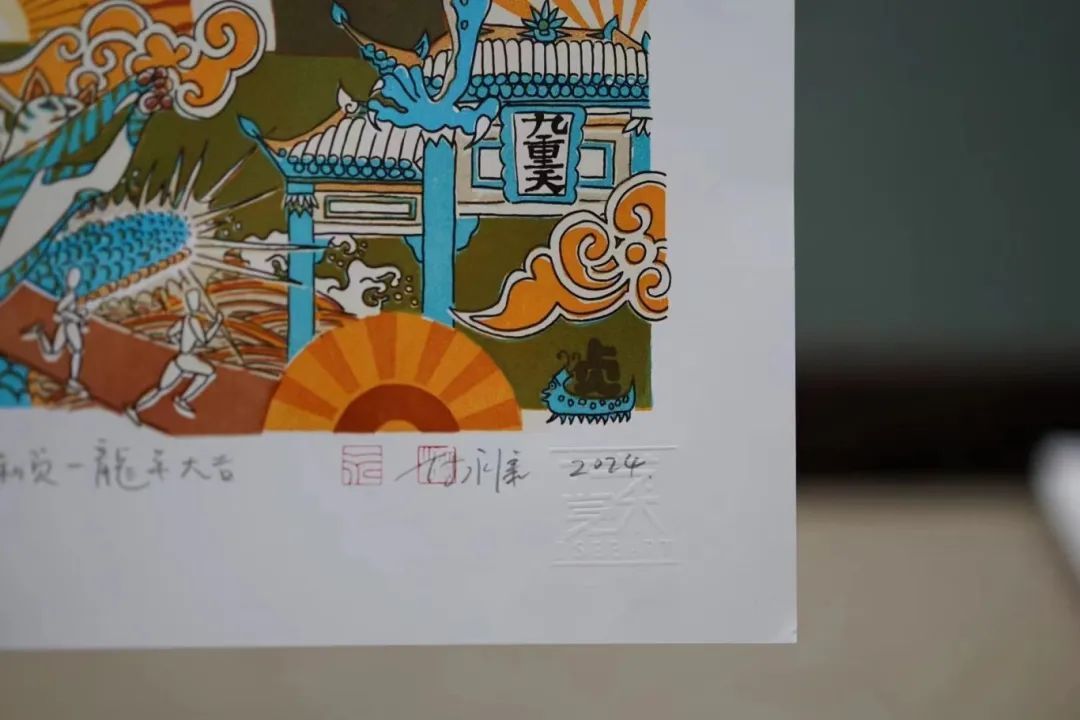 版画中的每一个图案都被赋予特殊寓意。画面中的烟花祈愿2024世界和平;左上角的鲤鱼身姿和龙头呼应,寓意鱼跃龙门;右下角的牌坊“九重天”,寓意祥龙飞升九天之上,新年更上一层楼;画面由一个弧形跑道在暗中连接,跑道上有跑步的人群,寓意运动健身成为生活时尚。