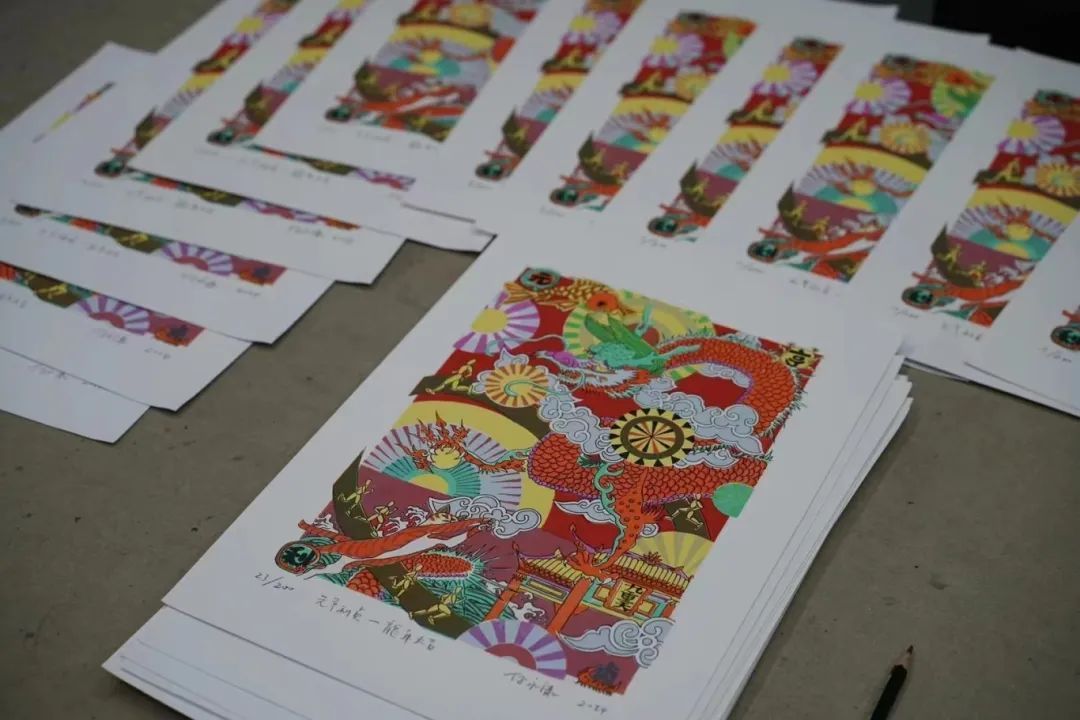 画面中的龙,龙头、龙身在空中,龙爪握龙珠,龙尾从水中摆出,首尾相应,腾越有力。“这条龙的灵感来自清代龙的形象,其中‘龙珠’与‘水’都寓意财运亨通。”付永康介绍,创作版画是一个精细活,需要有极致的耐心,一个步骤错误就会前功尽弃。