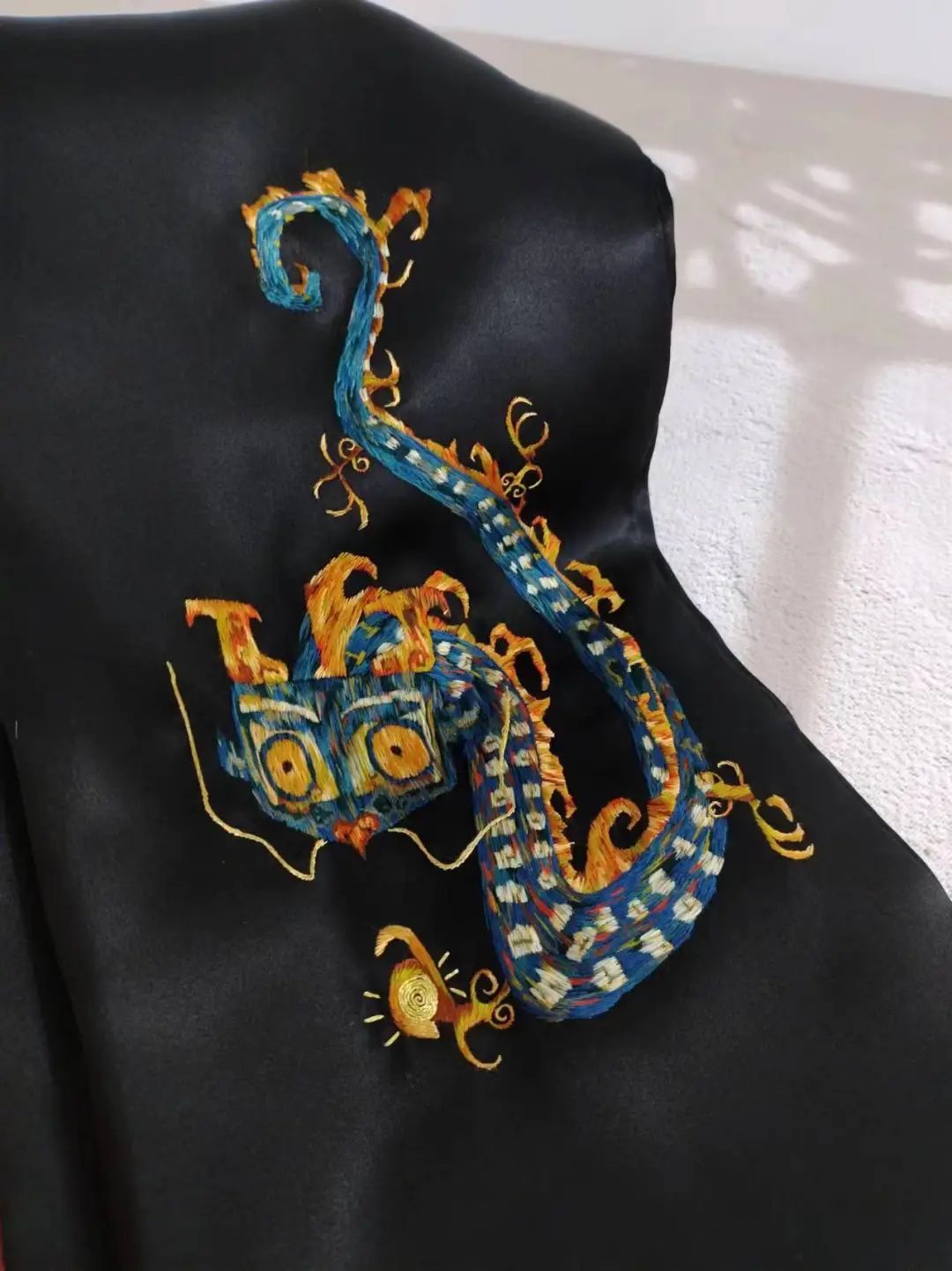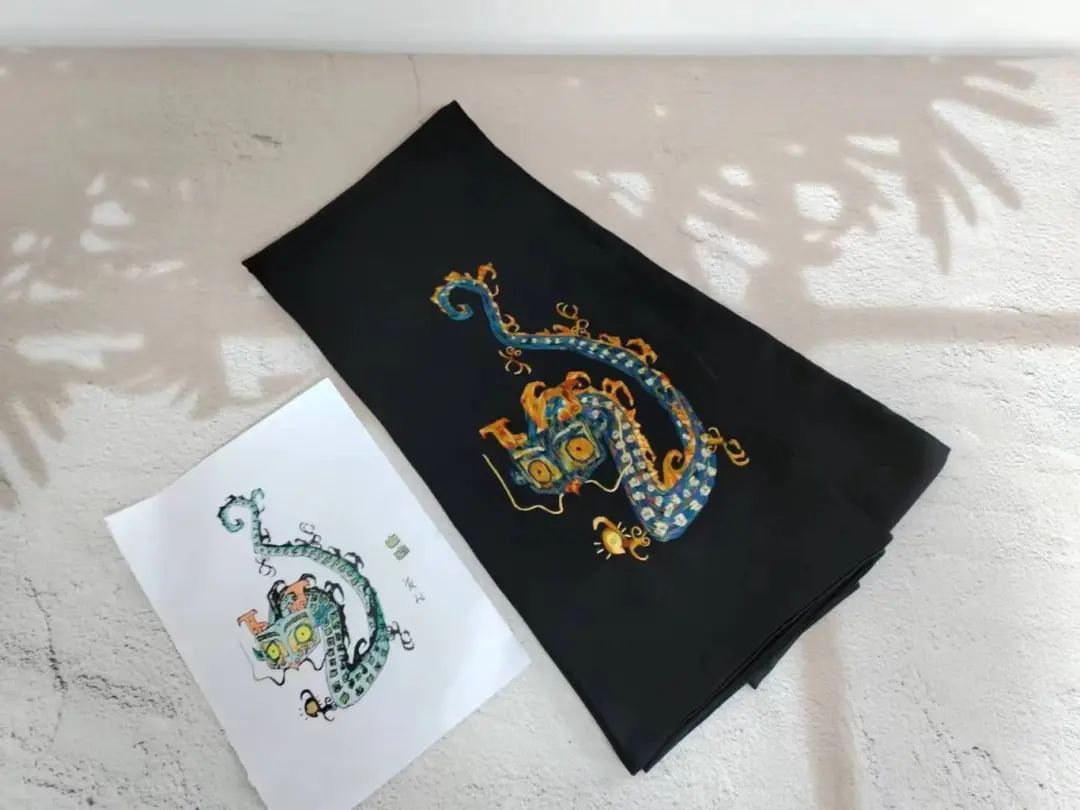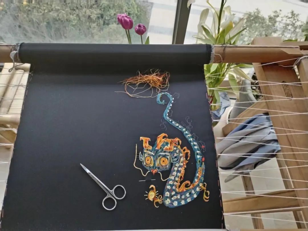 “一次和正见艺术工作室的老师讲起苏绣起源的故事,得知商周时期就有刺绣纹身出现,甚至可以追溯到遥远的图腾文化,便萌发了做一条最古老的龙的想法。”陈碧娴说。