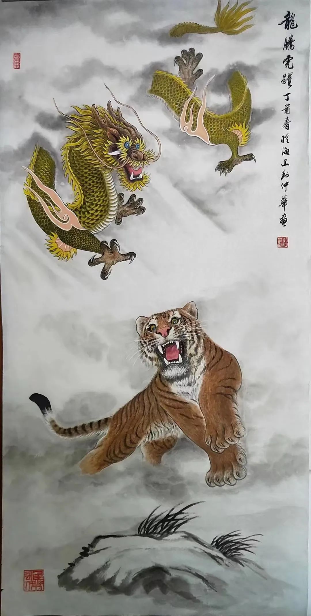巨龙腾空而起,穿梭于云雾之间;猛虎身姿矫健,挺立于山石之上。耄耋之年的封仲华创作的国画作品《龙腾虎跃》气势磅礴,曾在上海市委宣传部举办的画展上获奖。“这是工笔兼写意的画法,需要勾勒出龙和虎的形态,再用色彩逐层渲染,达到形神兼备的效果。”封仲华说。