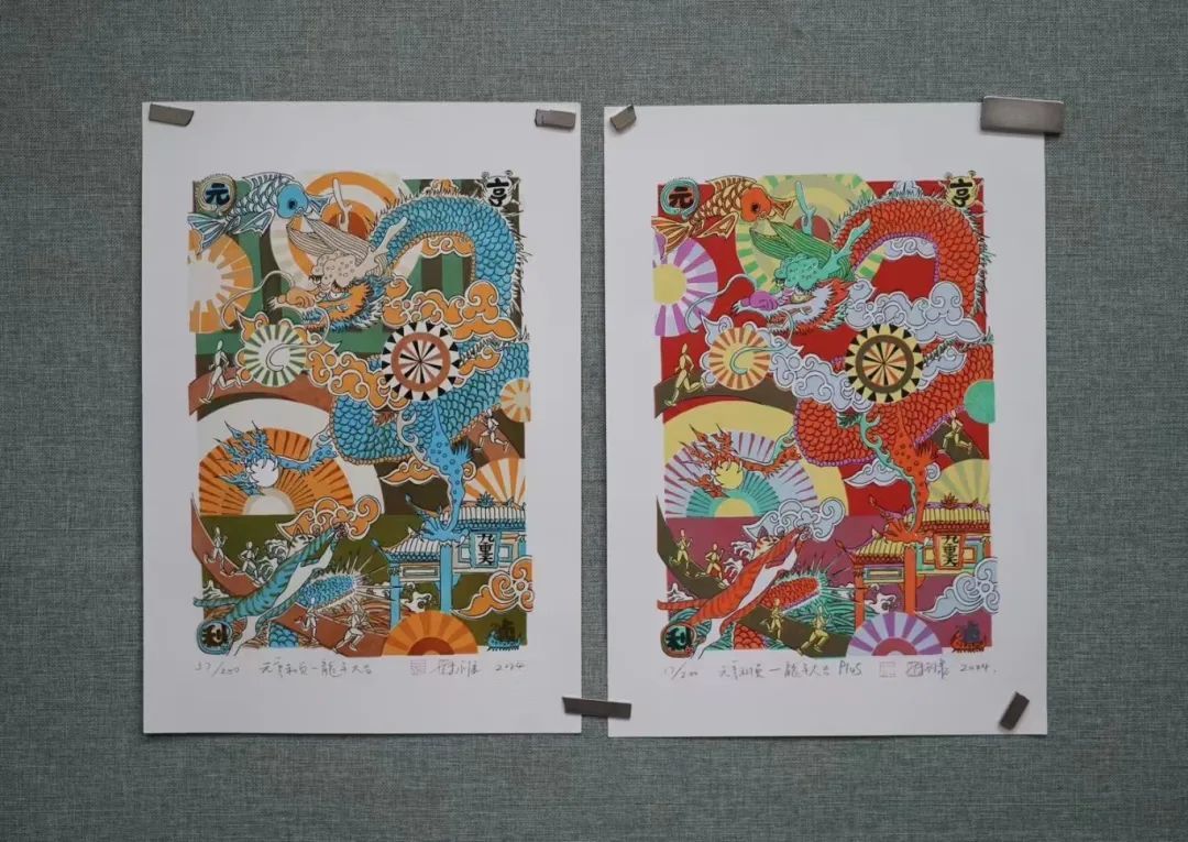 色彩明亮、刻画入神、包罗万象,《元亨利贞-龙年大吉》是嘉定青年版画艺术家付永康创作的龙年版画新作。“元亨利贞”四个字出自《易经》乾卦,乾卦以龙的不同处境比喻自然道法的流转规则,都有着良好的寓意。