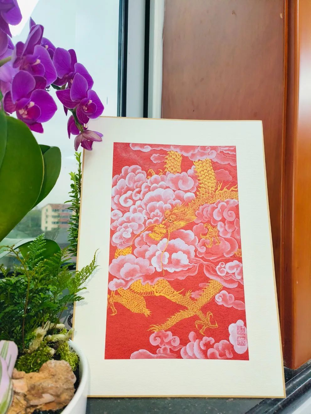 马陆居民丁佳妮绘制的水彩画《龙行大运》