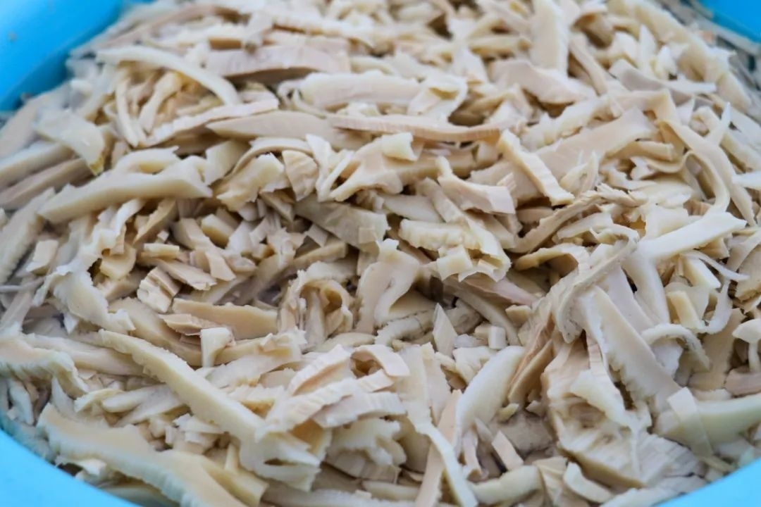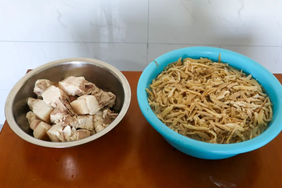 张明华说:“笋干要切得细一点,这样容易煮,汤汁才会被吸收,不仅好看,吃起来也好吃。第一遍煮好后,再将笋干切丝,用清水清洗。”