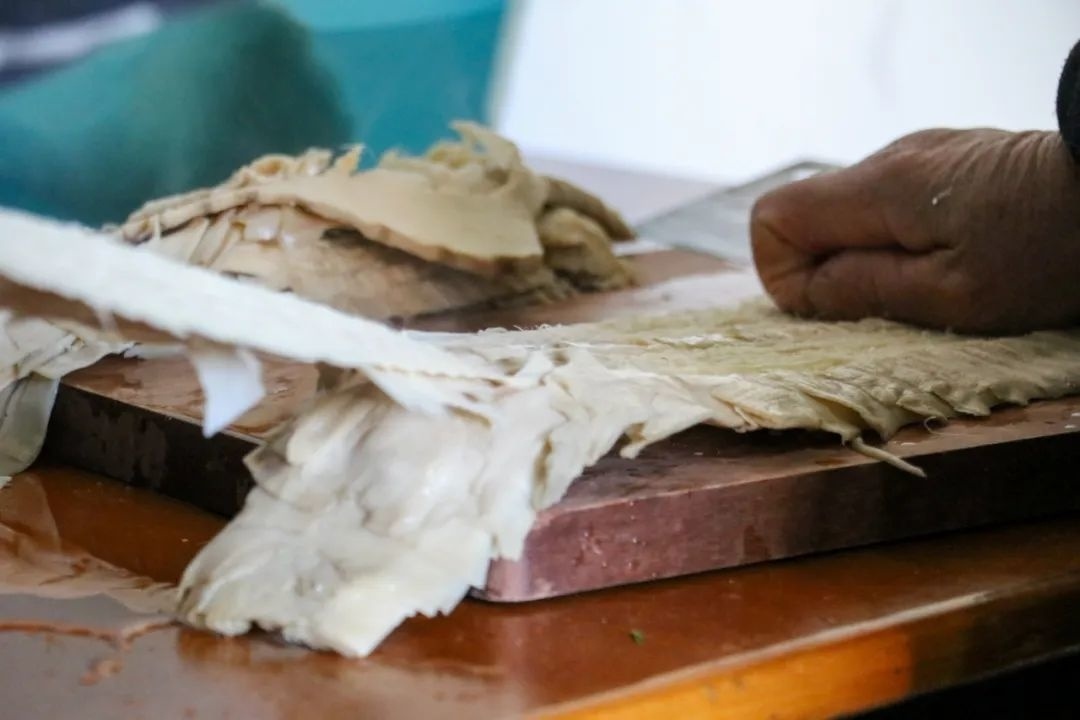 买回来的笋干,要用水浸泡5到7天,然后放进锅里烧。待到煮沸后,捞出笋干,用菜刀敲一敲再切片。