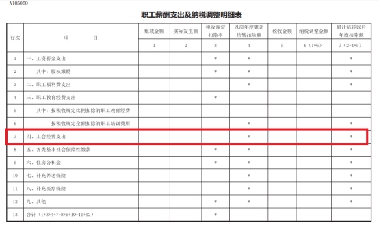 企业所得税汇算清缴时,工会经费税前扣除涉及《职工薪酬支出及纳税调整明细表》(A105050)第7行“四、工会经费支出”:填报纳税人本年度拨缴工会经费及其会计核算、纳税调整等金额,具体如下:
