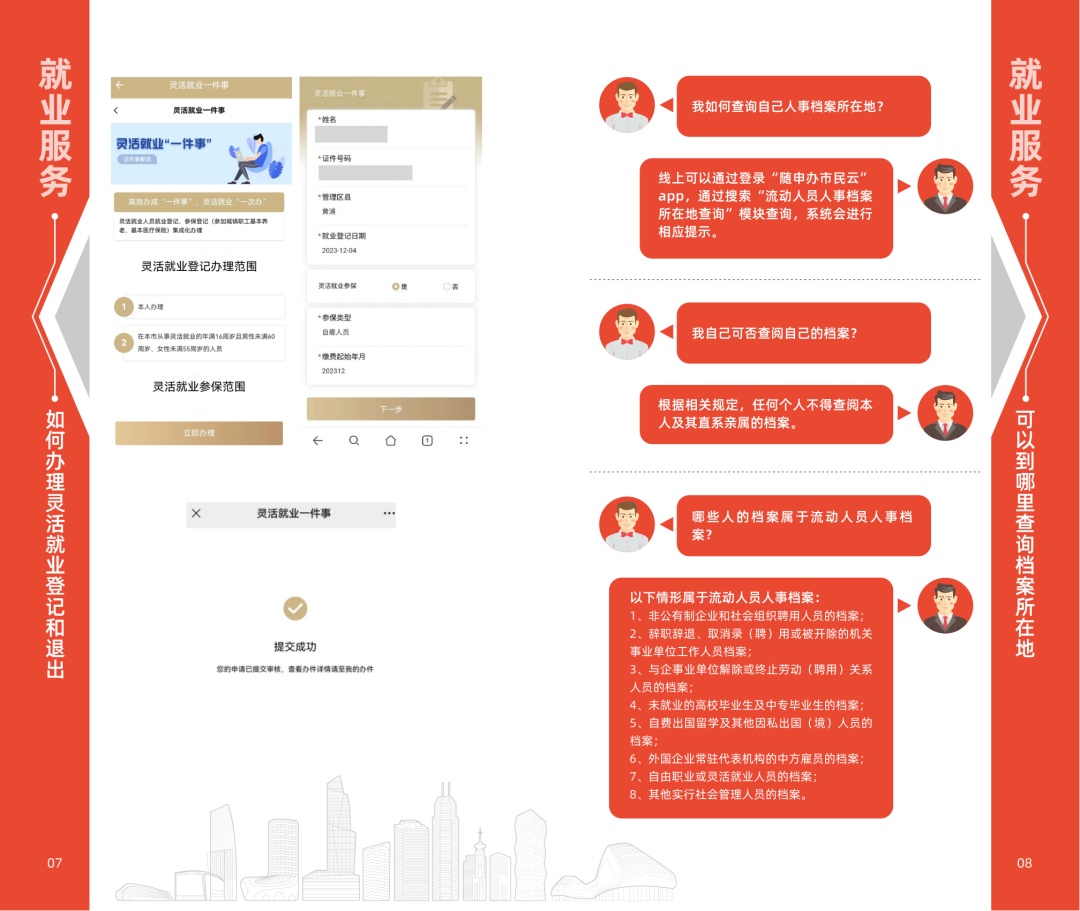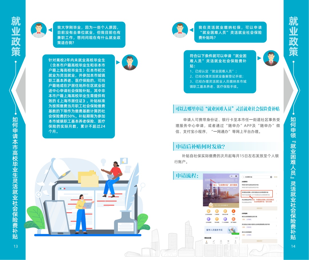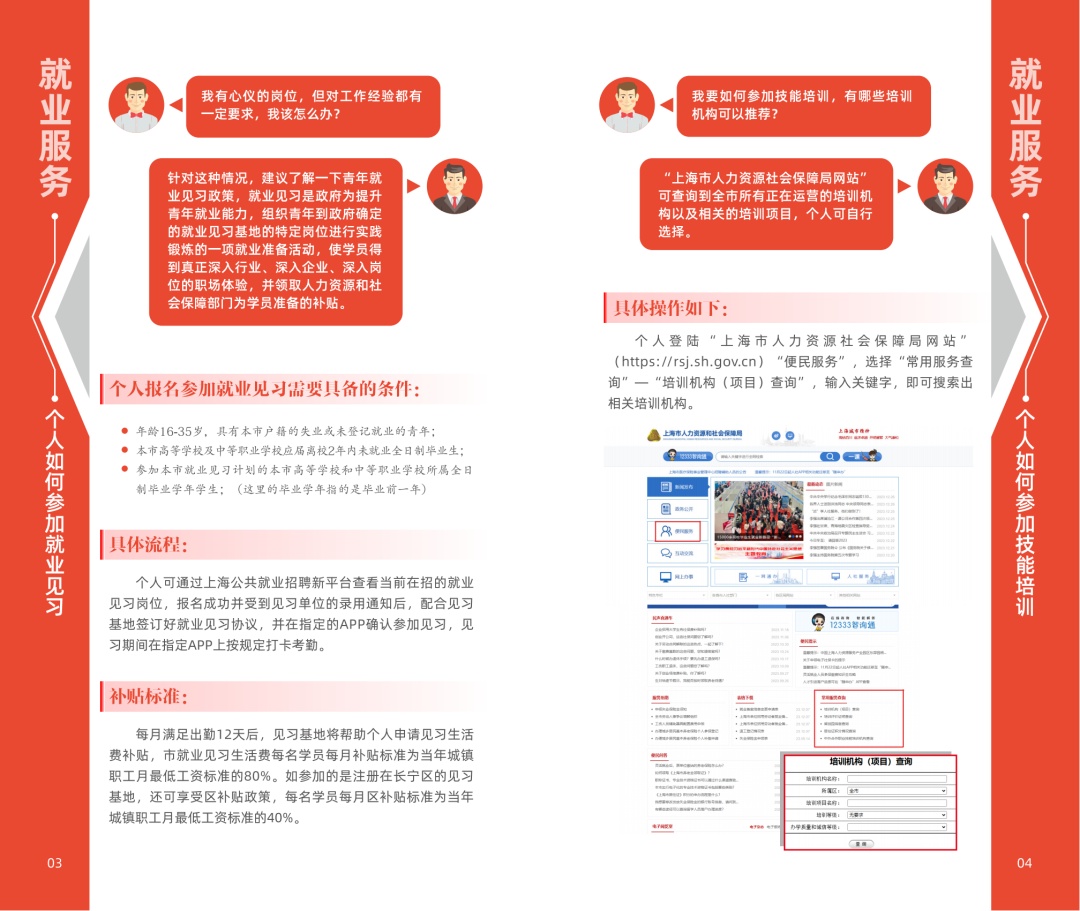 “重点群体”就业服务包二维码 服务包内容一览 目录 ◼就业服务: 求职者如何注册并登录上海公共招聘新平台? 如何预约并接受指导服务? 个人如何参加就业见习? 个人如何参加技能培训? 如何办理失业登记和退出? 如何办理灵活就业登记和退出? 学校转递档案后,可以到哪里查询档案所在地? ◼就业政策: 申请认定为就业困难人员有哪些条件? 如何申请本市高校毕业生灵活就业社会保险费补贴? 如何申请就业困难人员灵活就业社会保险费补贴? 如何申领大龄失业就业岗位补贴? ◼就业保障: 如何申领失业金? 失业人员如何申请并获得职业技能提升补贴?