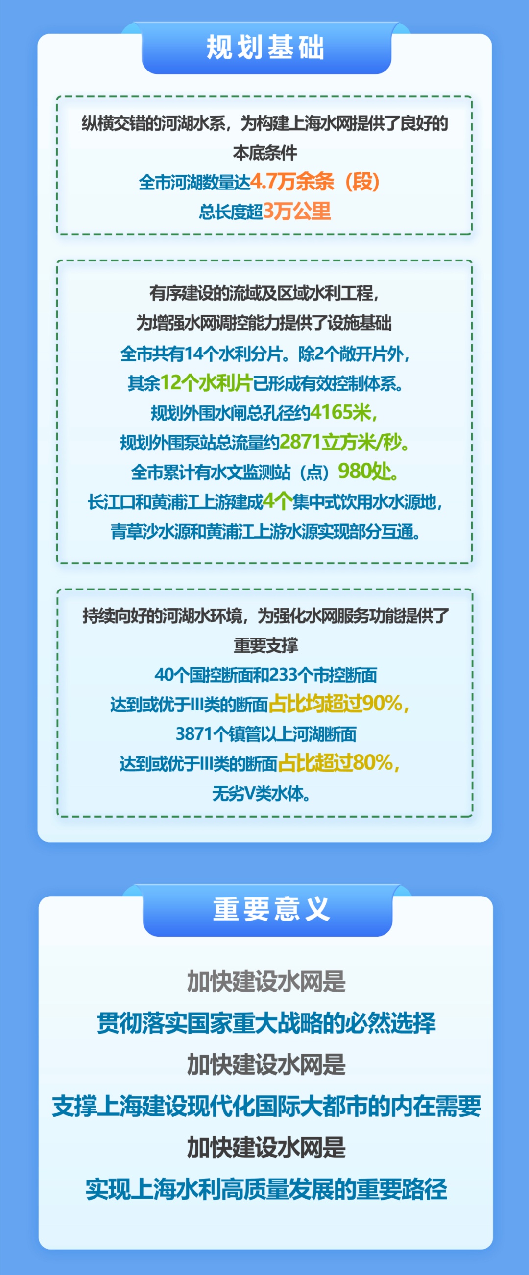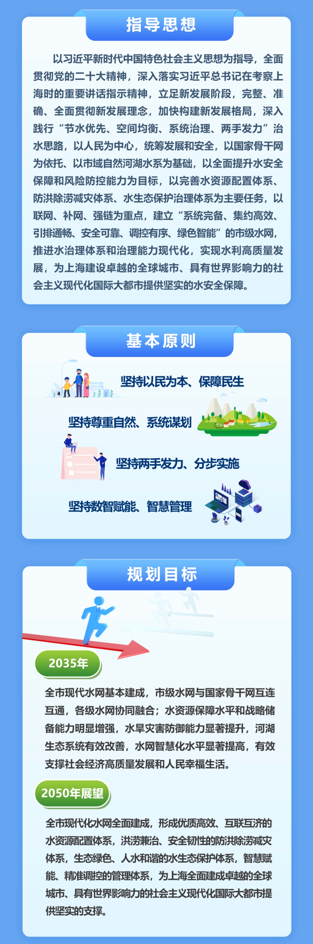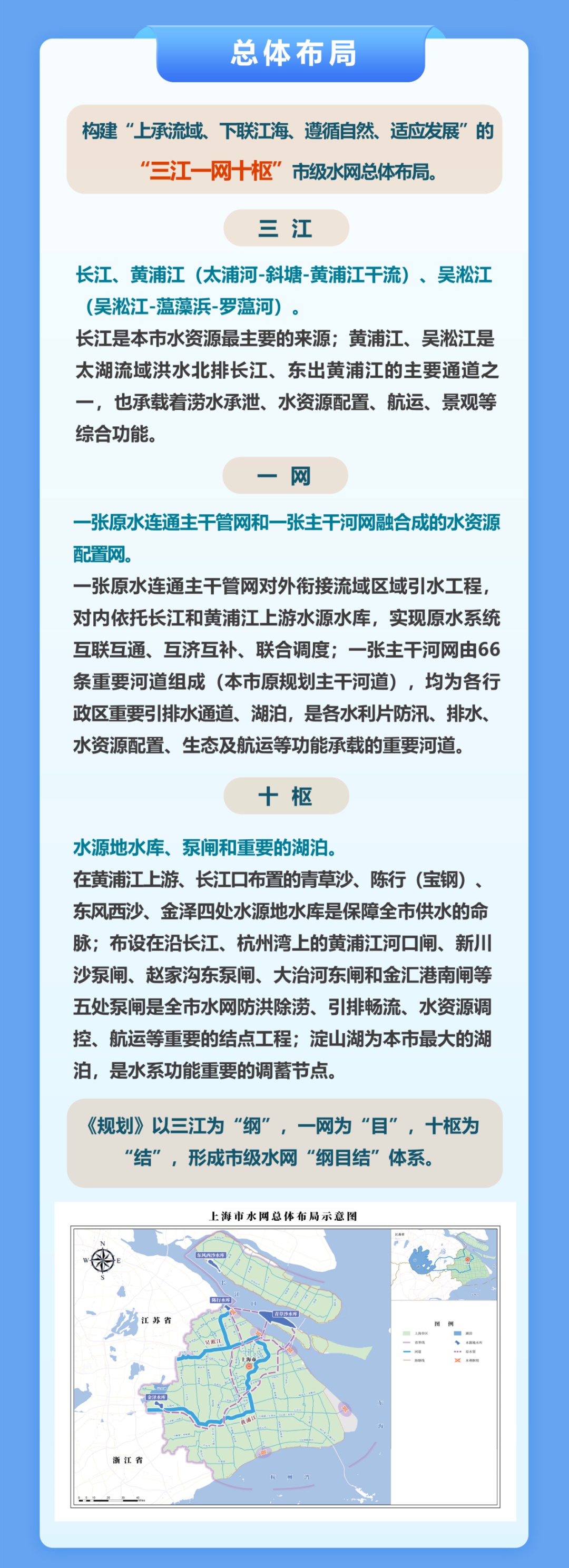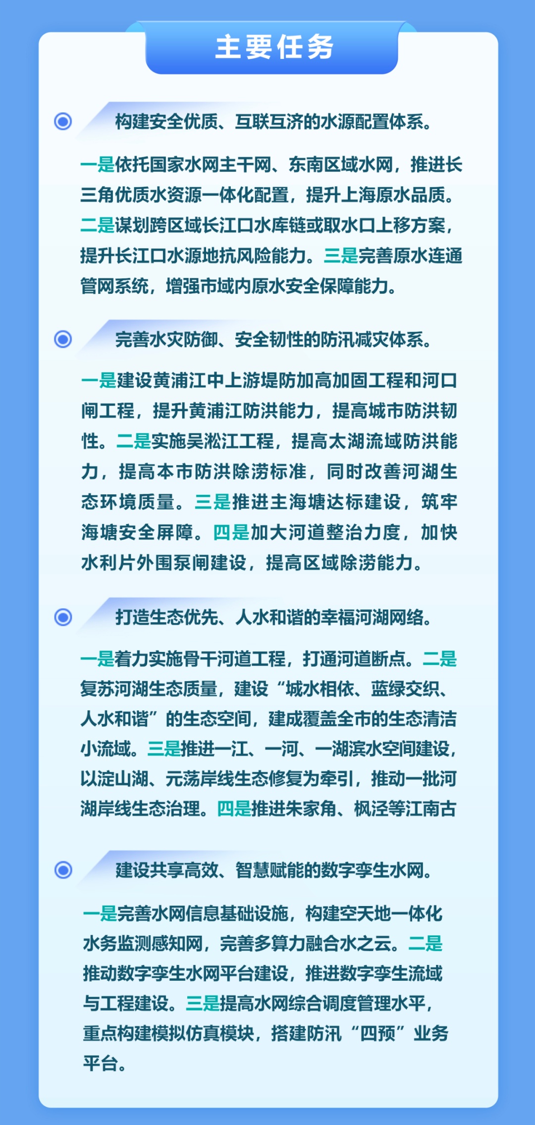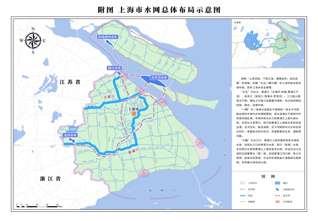 市水务局介绍,近日,上海市人民政府批复了《上海市水网建设规划》,是贯彻落实党中央、国务院决策部署的重要举措。《上海市水网建设规划》提出,要加快推进上海市水网与国家水网衔接,保障水资源安全、提高防洪减灾能力、优化水生态环境、推动智慧水务发展,为上海加快建成具有世界影响力的社会主义现代化国际大都市提供坚实的水安全保障。 上海滨江临海、河网密布。要坚持底线思维,以联网、补网、强链为重点,以全面提升水安全保障和风险防控能力为目标,以完善水资源配置体系、防洪除涝减灾体系、水生态保护治理体系为主要任务,统筹水安全与上海经济社会发展、生态文明建设的关系,谋划水网总体布局,通过工程和非工程措施,全面提升水网综合性、系统性、支撑性和安全性,实现水利高质量发展。 上海水网总体布局为“三江一网十枢”。三江指长江、黄浦江、吴淞江。一网为一张原水连通主干管网和一张主干河网融合成的水资源配置网。十枢指四大水源地水库、五座大型泵闸和淀山湖。其中,三江为“纲”,一网为“目”,十枢为“结”,形成市级水网“纲、目、结”体系。 上海水网建设的主要任务为: 构建安全优质、互联互济的水源配置体系 一是依托国家水网主干网、东南区域水网,推进长三角优质水资源一体化配置,提升上海原水品质。二是谋划跨区域长江口水库链或取水口上移方案,提升长江口水源地抗风险能力。三是完善原水连通管网系统,增强市域内原水安全保障能力。 完善水灾防御、安全韧性的防汛减灾体系 一是建设黄浦江中上游堤防加高加固工程和河口闸工程,提升黄浦江防洪能力,提高城市防洪韧性。二是实施吴淞江工程,提高太湖流域防洪能力,提高本市防洪除涝标准,同时改善河湖生态环境质量。三是推进主海塘达标建设,筑牢海塘安全屏障。四是加大河道整治力度,加快水利片外围泵闸建设,提高区域除涝能力。 打造生态优先、人水和谐的幸福河湖网络 一是着力实施骨干河道工程,打通河道断点。二是复苏河湖生态质量,建设“城水相依、蓝绿交织、人水和谐”的生态空间,建成覆盖全市的生态清洁小流域。三是推进一江、一河、一湖滨水空间建设,以淀山湖、元荡岸线生态修复为牵引,推动一批河湖岸线生态治理。四是推进朱家角、枫泾等江南古镇和五个新城的江南韵味水网建设。 建设共享高效、智慧赋能的数字孪生水网 一是完善水网信息基础设施,构建空天地一体化水务监测感知网,完善多算力融合水之云。二是推动数字孪生水网平台建设,推进数字孪生流域与工程建设。三是提高水网综合调度管理水平,重点构建模拟仿真模块,搭建防汛“四预”业务平台。 (点击图片查看大图)