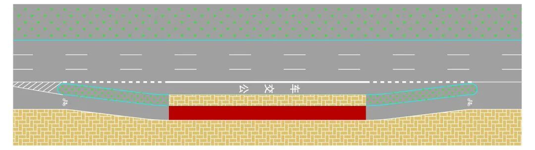 对于高架下地面道路交叉口或中央分隔带宽度≥3m的交叉口,可结合分隔带前空间,设置彩色铺装的路中标识块作为非机动车直行、左转待行区。