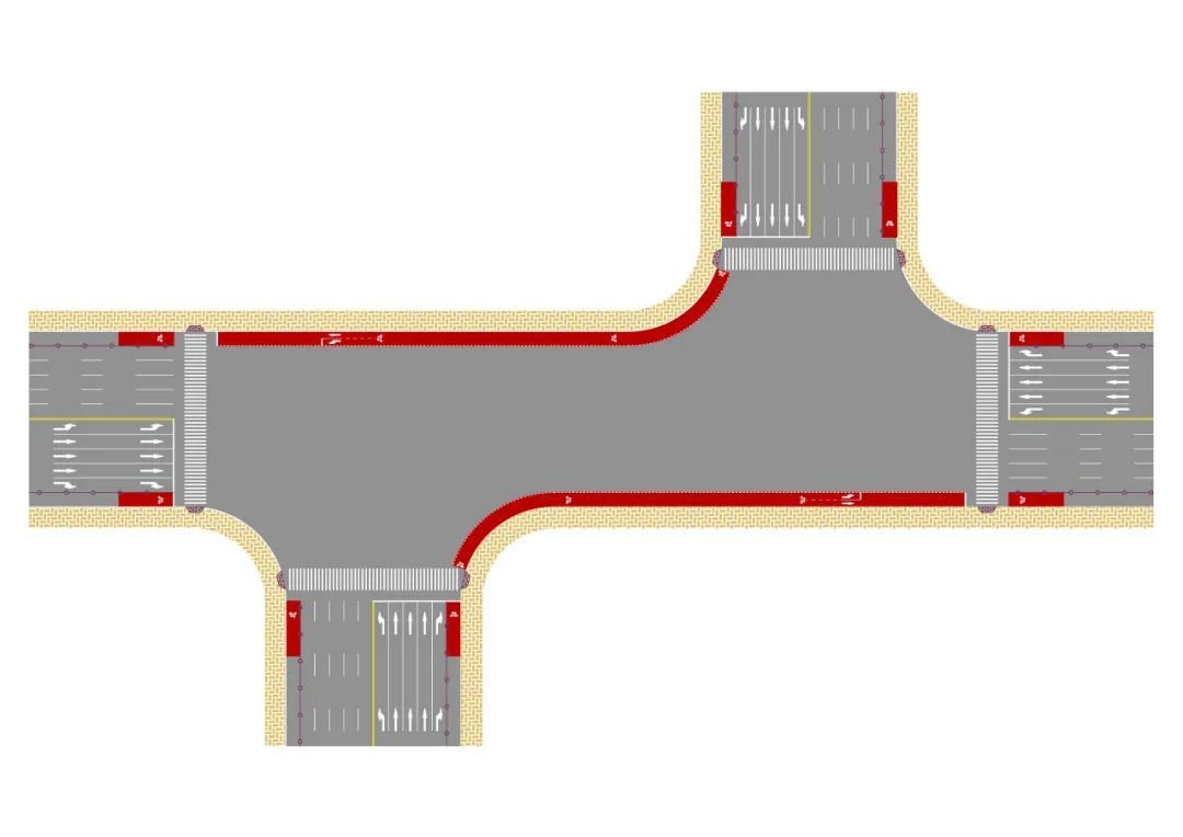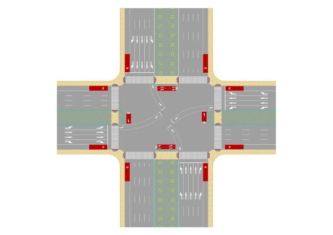 在非机动车道交叉口进出口道设置彩色铺装,颜色采用宝石红。通过彩色铺装增强非机动车道醒目性,强化非机动车路权保障。