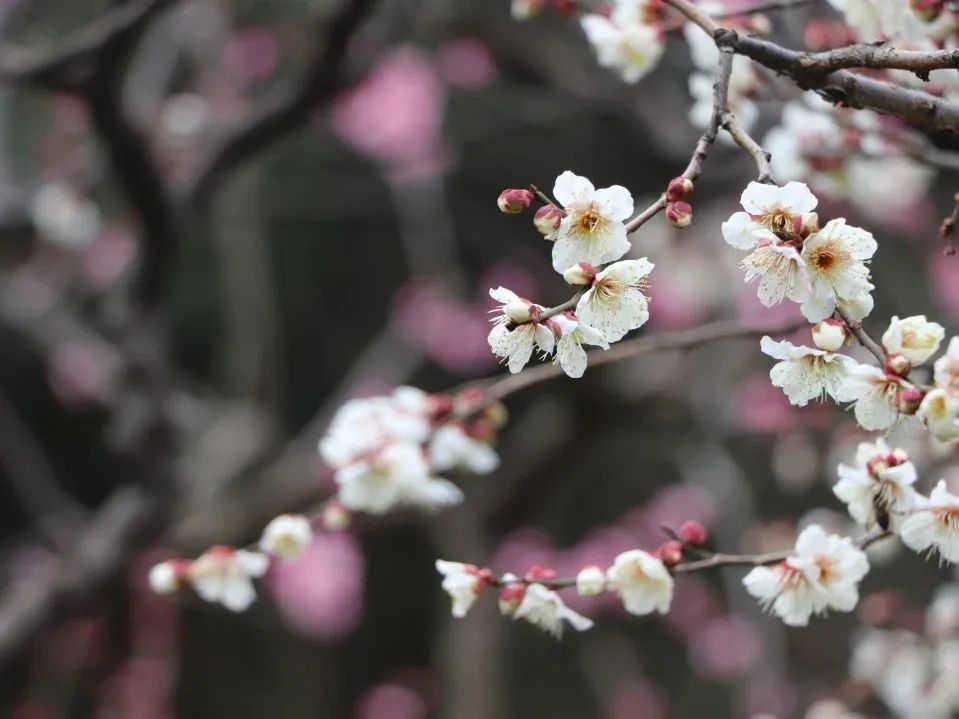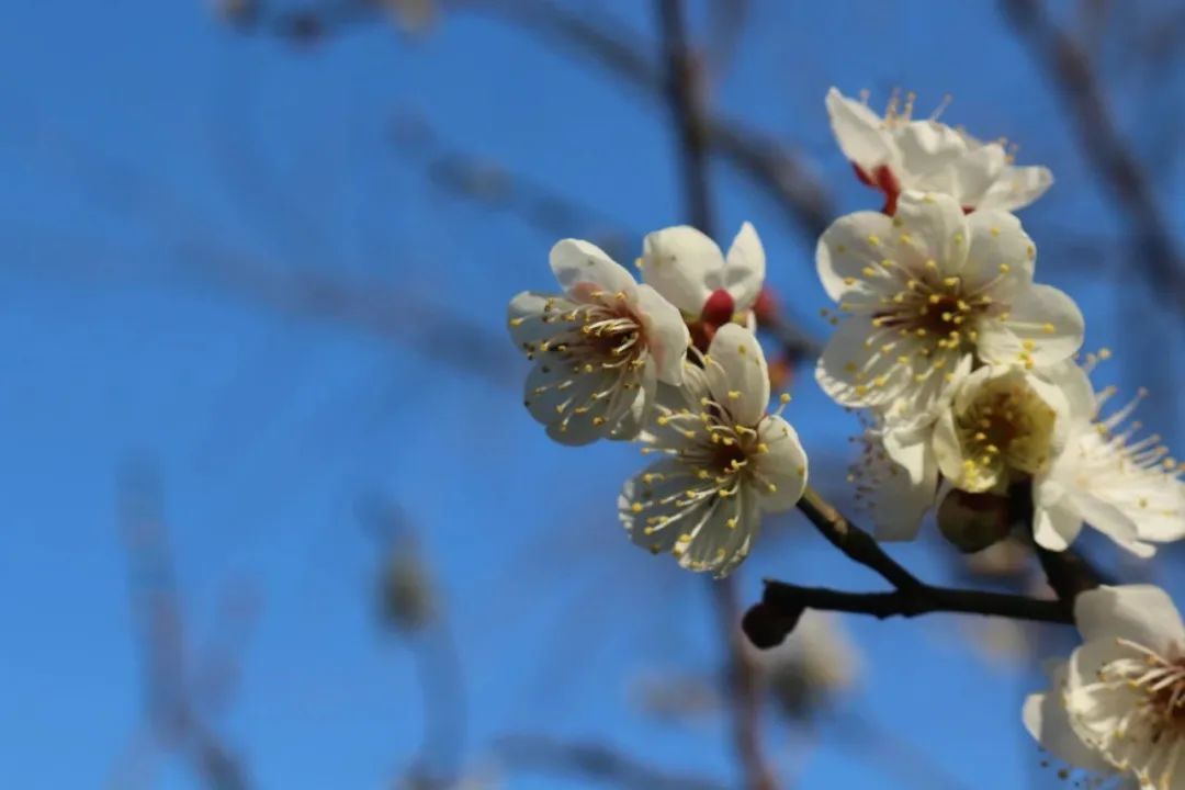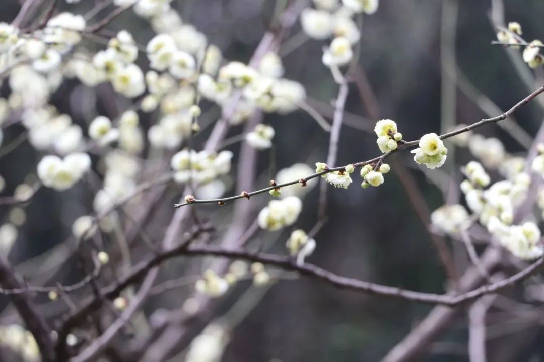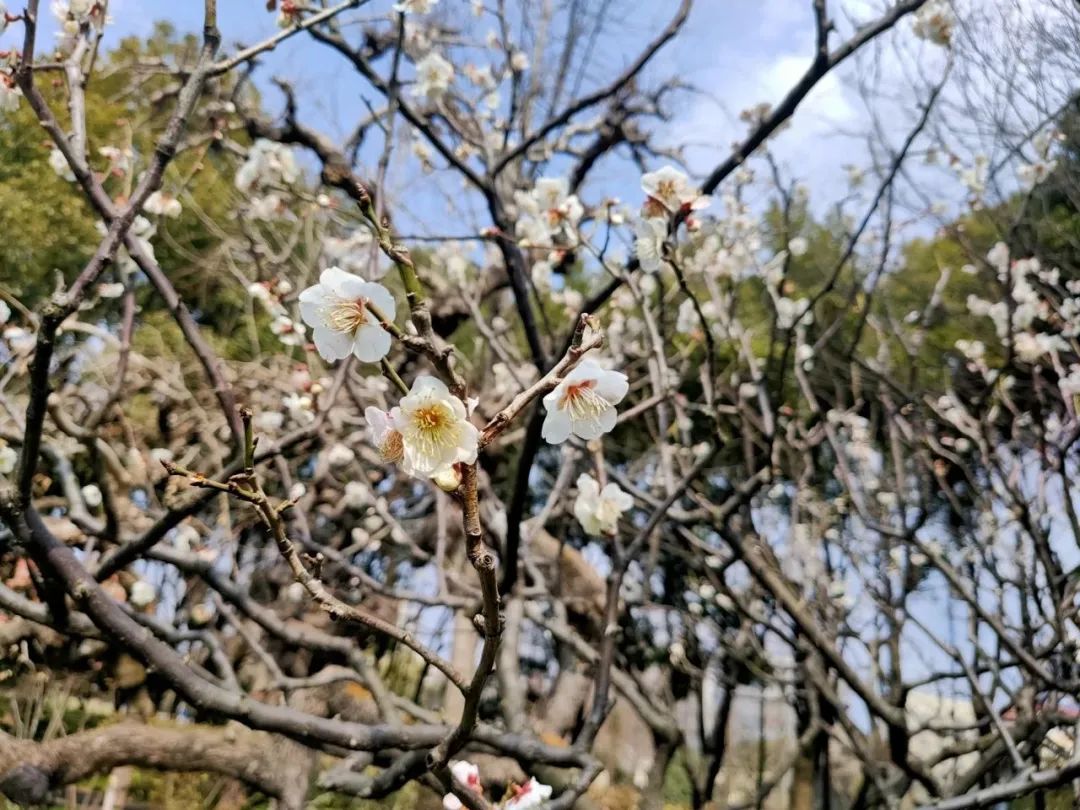 见惯了大片鲜艳的红梅,位于康健园的白梅则另有一番风姿,枝枝条条缀满清逸幽雅、冰清玉洁的花蕊,玲珑如玉,轻风摇曳,行走其间,仿佛置身白色花海。