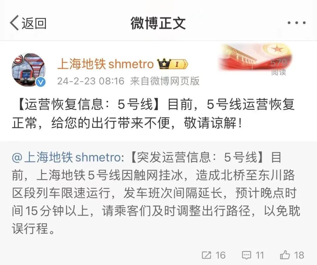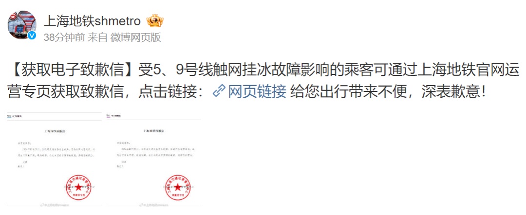 你今天上班迟到了吗?受5、9号线触网挂冰故障影响的乘客,可通过上海地铁官网运营专页获取致歉信(点击文末阅读原文链接)。
