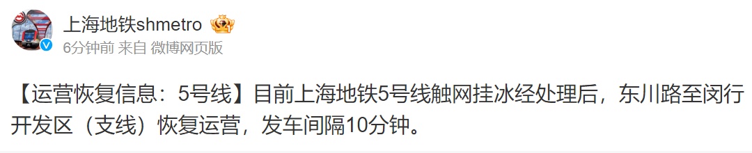 目前上海地铁5号线触网挂冰经处理后,东川路至闵行开发区(支线)恢复运营,发车间隔10分钟。