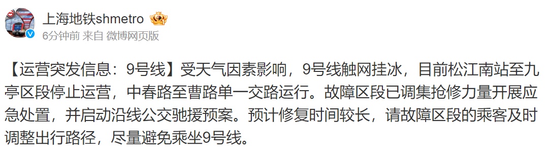 受天气因素影响,9号线触网挂冰,目前松江南站至九亭区段停止运营,中春路至曹路单一交路运行。故障区段已调集抢修力量开展应急处置,并启动沿线公交驰援预案。预计修复时间较长,请故障区段的乘客及时调整出行路径,尽量避免乘坐9号线。