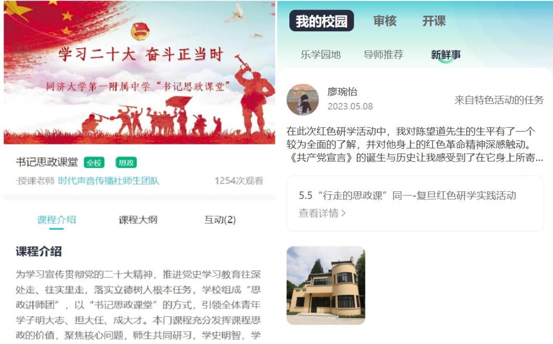 “数字·思政”场景实现“OMO”思政大讲堂,开设“信仰加油站”“同上一堂思政课”等线上思政学习空间,还有“书记思政课堂”系列微课视频,丰富学习资源。此外,学校组织“行走的思政课”活动,实现线上线下融合。