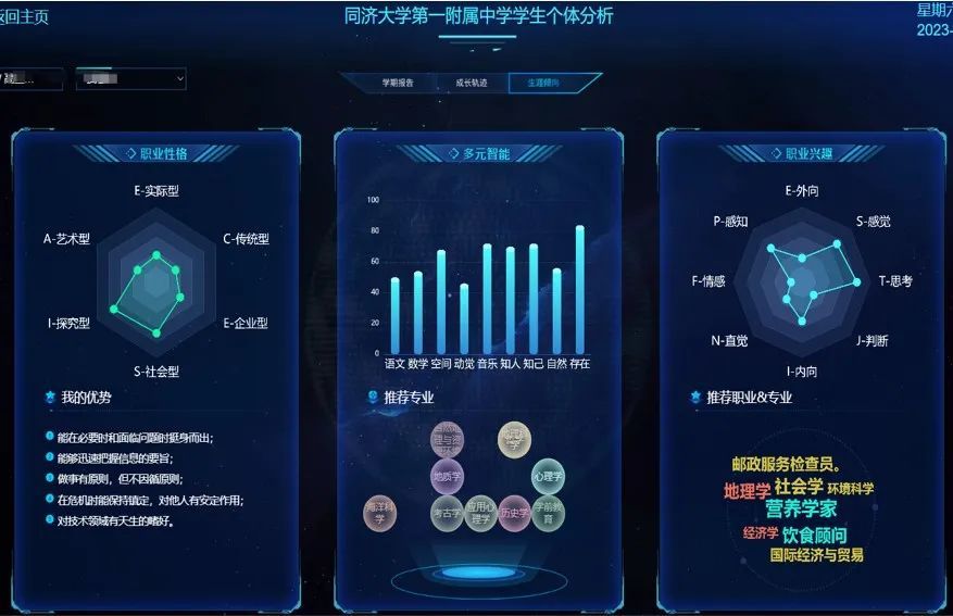依托信息化平台,学校形成了学生个性化发展动态的“数字画像”和“数字档案”,呈现同学们德智体美劳各领域发展与反馈,展示学生不同领域的发展优势、不足,最终为学生形成高中三年期间的“成长轨迹图谱”。