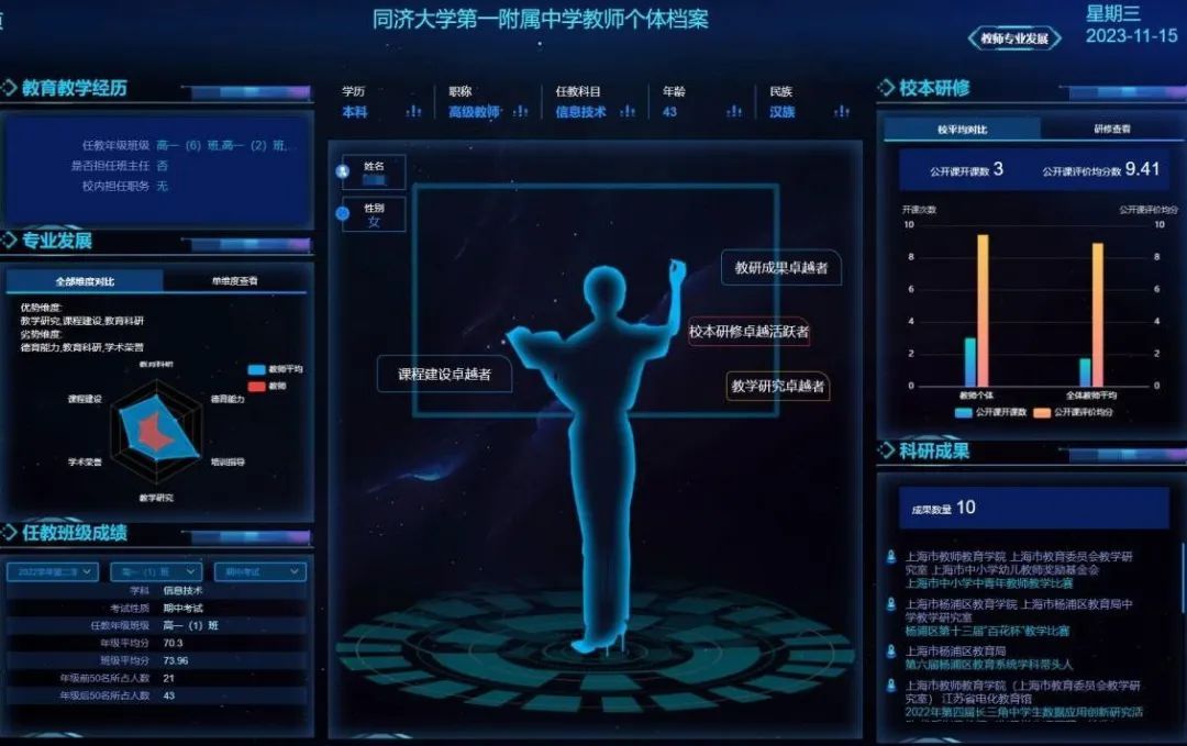 “数字·教师发展”场景采集关于课程建设、教学研究、德育能力、教育科研、培训指导和学术荣誉六大维度的过程性数据,实现教师主体数据全维度、跨应用的聚合,生成一师一发展的教师画像,助力学校整体师资梯度建设以及教师个体成长。