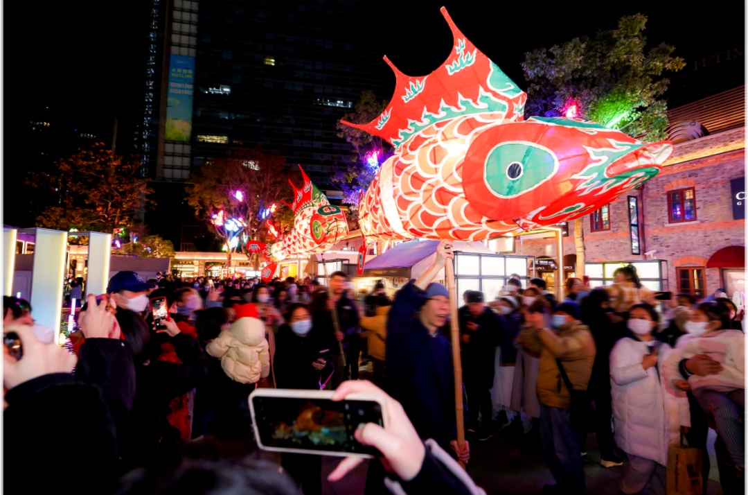 历史与文化交融的百年弄堂里,潮趣龙灯、AR游戏、非遗鸬鸟鳌鱼灯舞、元宵美食集,与团聚赏花灯、猜灯谜、吃汤圆的人们构成了一幅充满人间烟火气的“上海弄堂元宵百景图”。