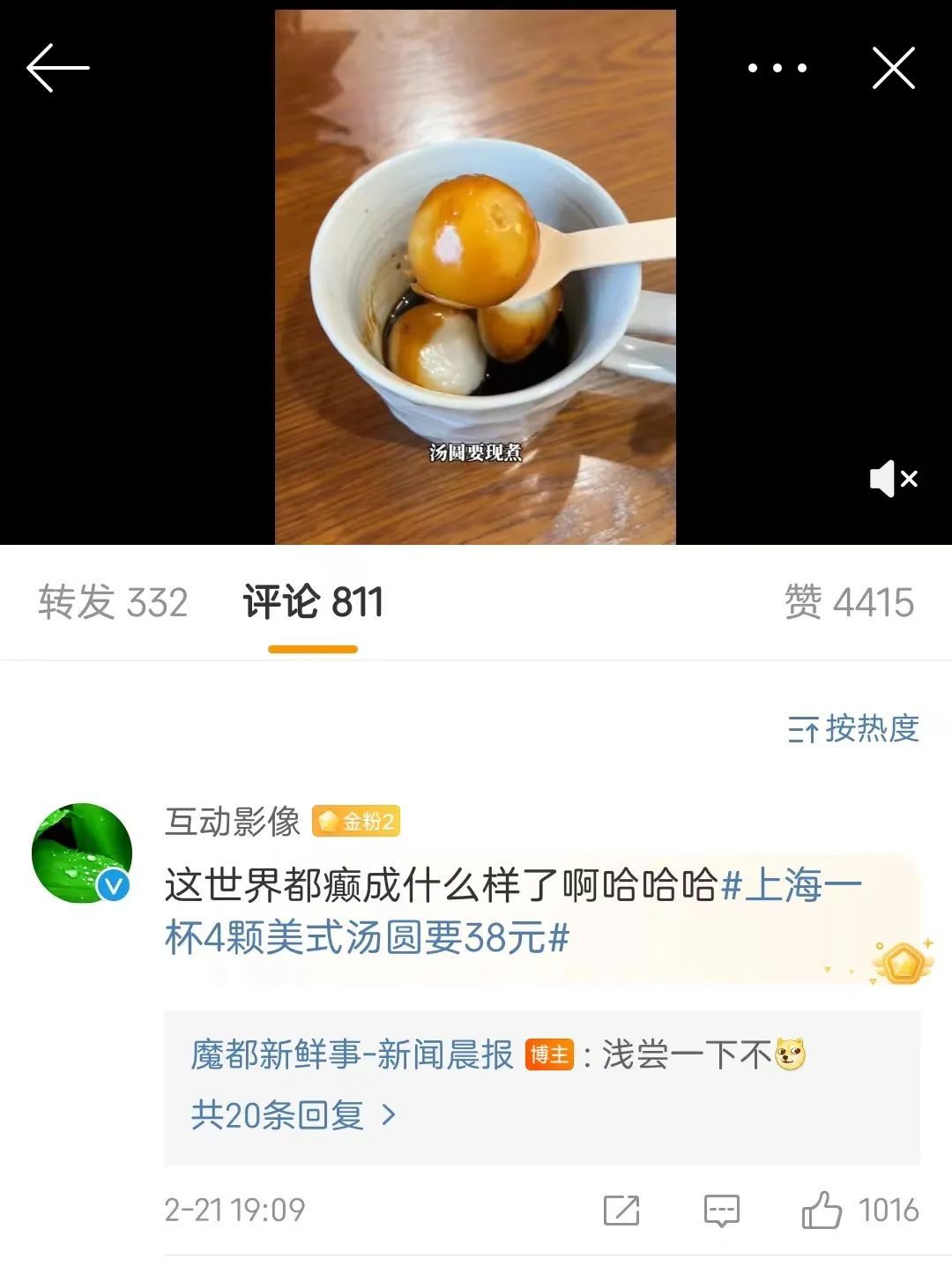 借着元宵节的时间节点,近期,上海某咖啡店上架一款咖啡+汤圆的组合,让爱喝咖啡和爱吃汤圆的小伙伴们震惊不已!这一话题也很快冲上了热搜,有网友评论调侃:这世界都癫成什么样了啊;还有网友说,猛一看以为茶叶蛋呢!下一个网红产品也想好了,就卖咖啡蛋吧!
