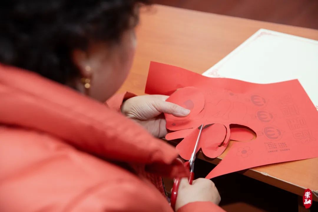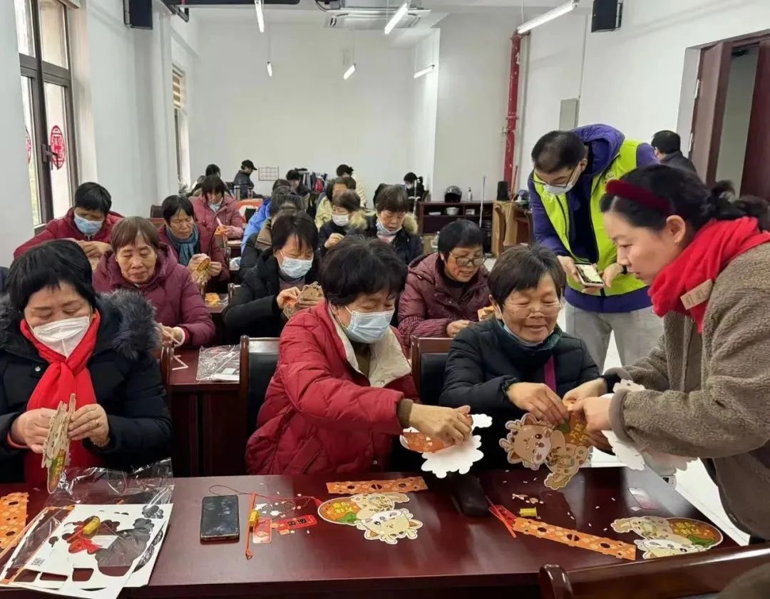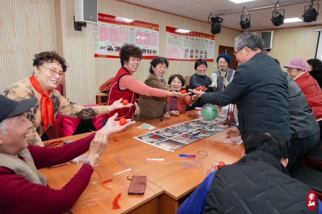 铺开一张张红纸,沿着轮廓细细裁剪,大家围坐一堂,体会剪纸艺术的魅力。现场互动频繁,有说有笑,气氛热闹融洽;剪纸过后,是另一堂传统手工课程。非遗传承人杨宁专程从市区赶来,现场教授海派绣球制作。在杨老师的指导下,一个个颜色鲜艳、纹样丰富的绣球逐渐成型。在亲手实践中,大家感受到精美的非遗文化,丰富了业余生活。