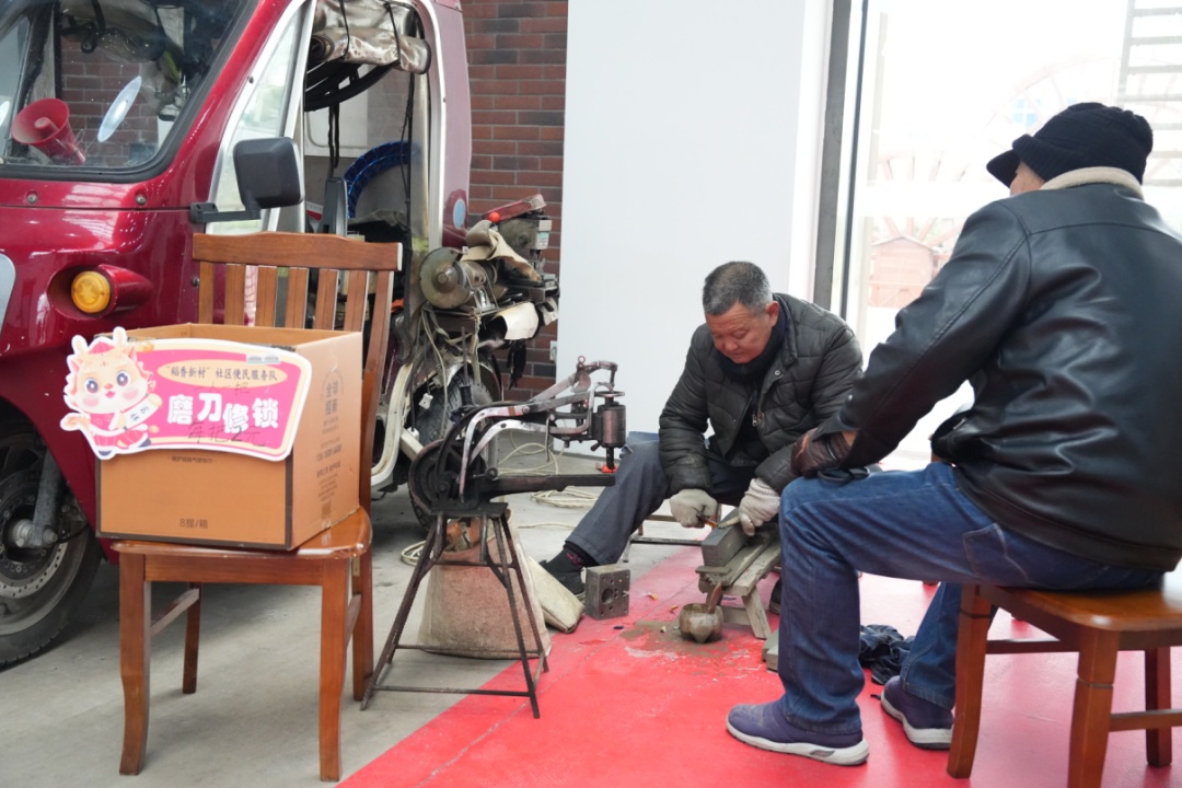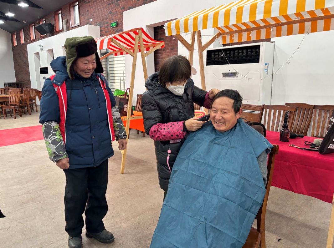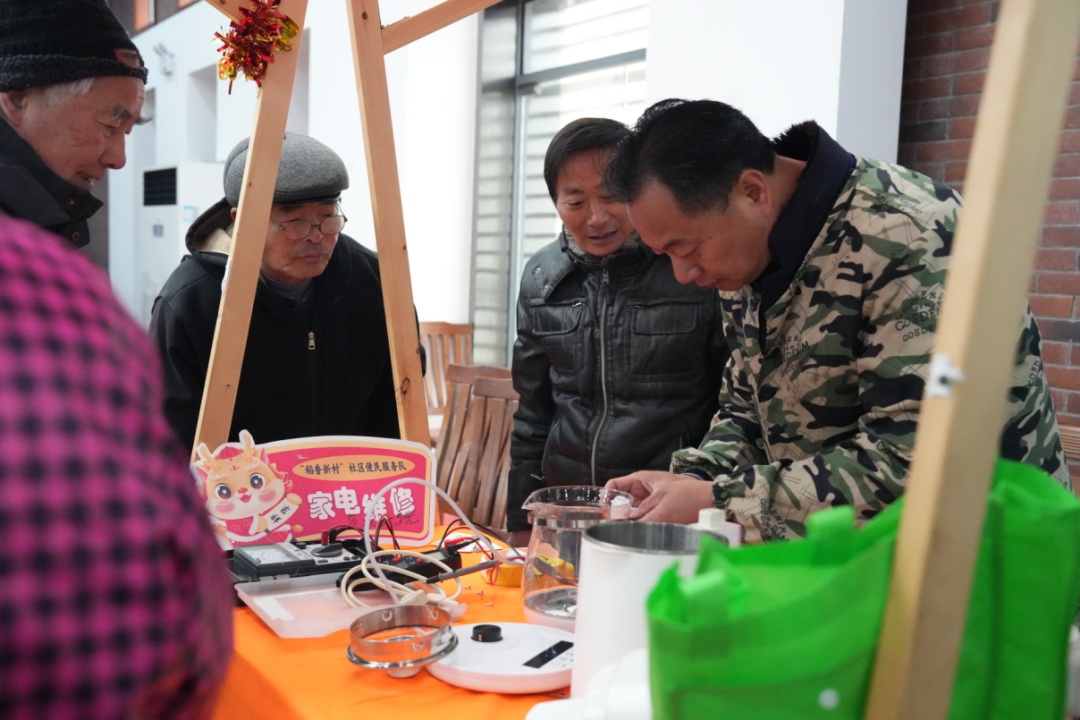 现场,喜庆的音乐、鼎沸的人声交织成一片,热闹非凡。除了一个个摆满了新村本地产品和特色美食的摊位,新村乡党委政府还专门辟出一块区域,由“稻香新村”志愿者服务队提供磨刀修鞋、衣服缝补、家电维修、便民理发等多种社区服务,给周边群众带来更加便利的生活体验。