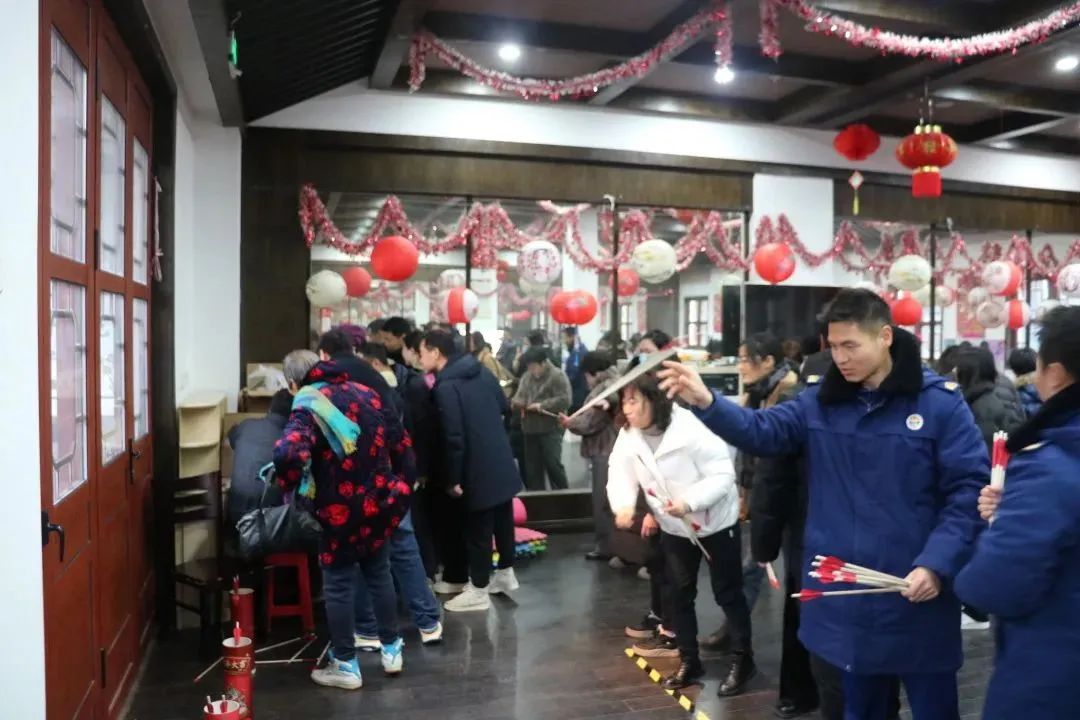 活动中,五颜六色的中国风灯笼挂满活动现场,大家一起参与猜灯谜、投壶等民俗小游戏,积极思考、交流讨论、竞猜谜底,热闹非凡,共同感受凝心聚力、团结奋进的精神。