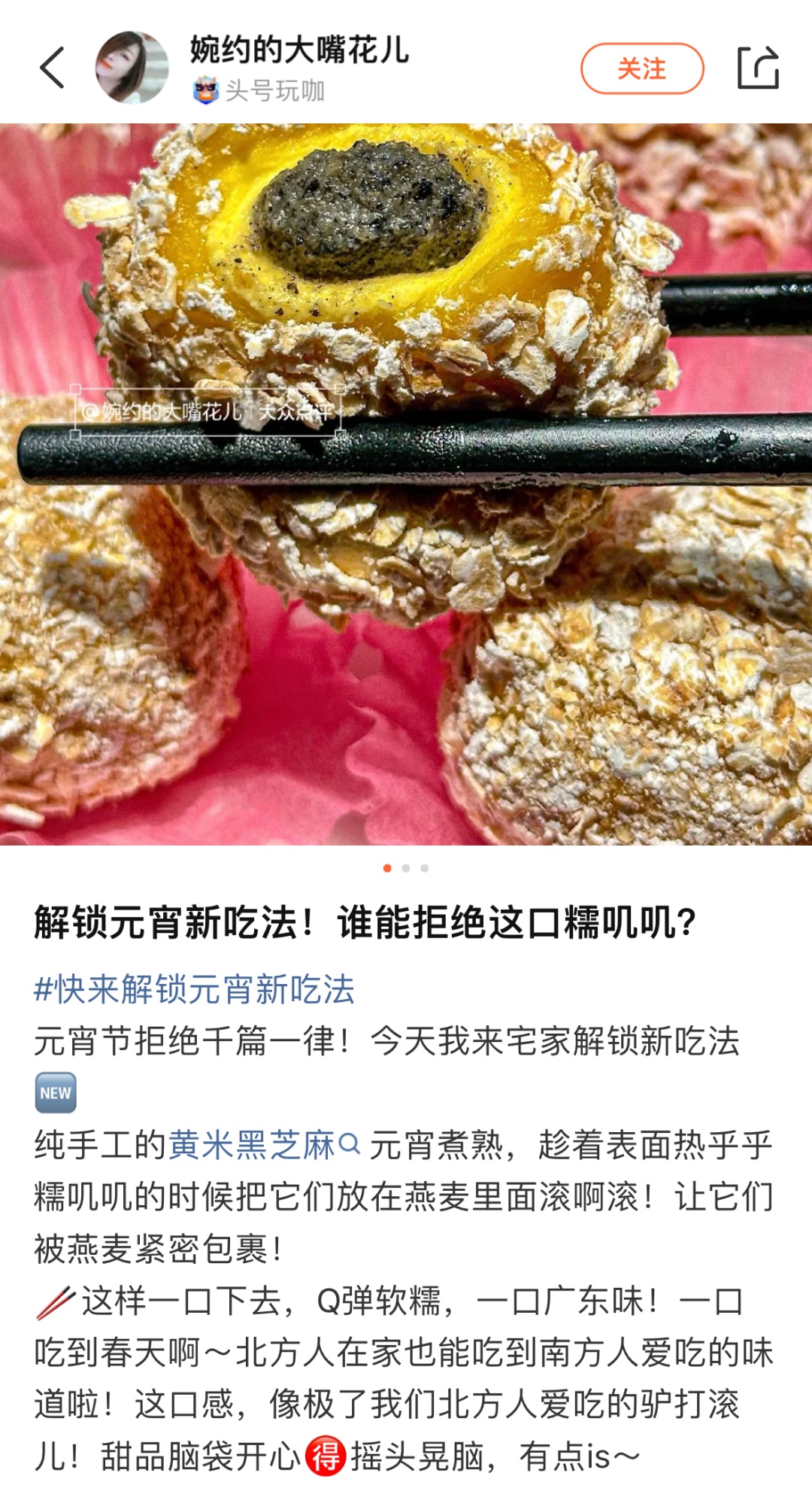 在大众点评上,网友分享的自创吃法更令人称赞。“刷到一篇美食博主分享的‘燕麦滚元宵’教程笔记,感觉很香很好吃,迫不及待就试了”,喜爱烘焙的张女士热衷于“尝鲜”,“我用空气炸锅做的,每一口都外酥内软,家人试过都说不错,晒了朋友圈后同事们也说想尝尝。”