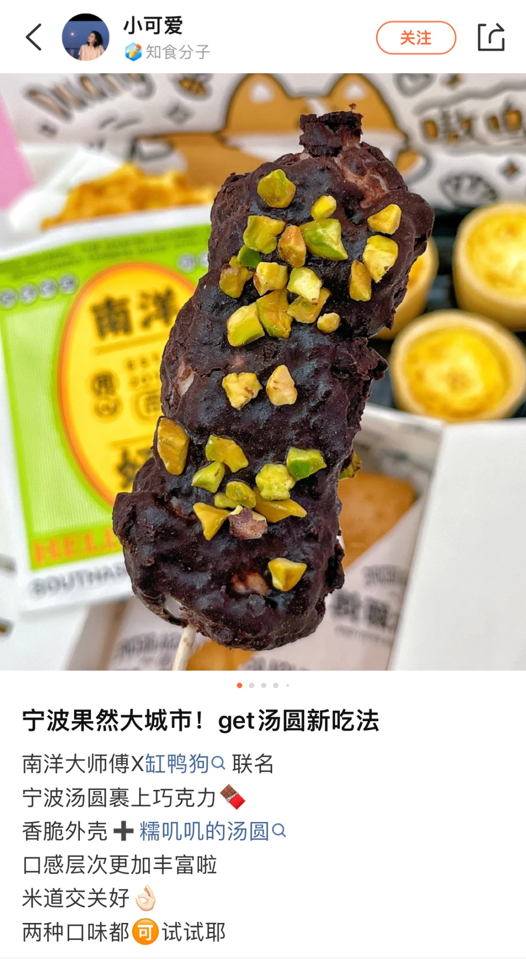 而另一家宁波老字号汤圆品牌缸鸭狗,推出新品“汤圆串串”——将特色果馅汤圆穿成串,浇上巧克力浆,再撒上果干碎,主打口感层次丰富。“既像北方的糖葫芦串儿,又像香巧脆皮冰淇淋”,吃过的消费者表示,这比普通汤圆的风味、口感丰富有趣得多。