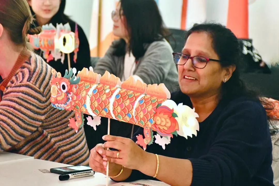 2月23日,华漕镇举办“与外国朋友一起过元宵节”活动,西班牙、德国、美国、印度、捷克的外籍居民,新侨代表、新时代文明实践分中心讲师和诸翟学校学生志愿者在听“龙”的故事、制作“龙灯”、做元宵等一系列活动中共迎佳节,共同感受中华传统文化魅力。正月十五闹花灯,闹花灯是元宵节传统节日习俗。在老师的指导下,大家做起了简易龙灯,裁剪、折叠、拼装、上色……来自美国的外籍居民Nicole Stewart第一个完成了龙灯制作,“这是我第一次参与到传统做龙灯的活动,很有趣,感觉非常好”,Nicole Stewart表示。