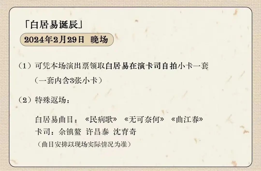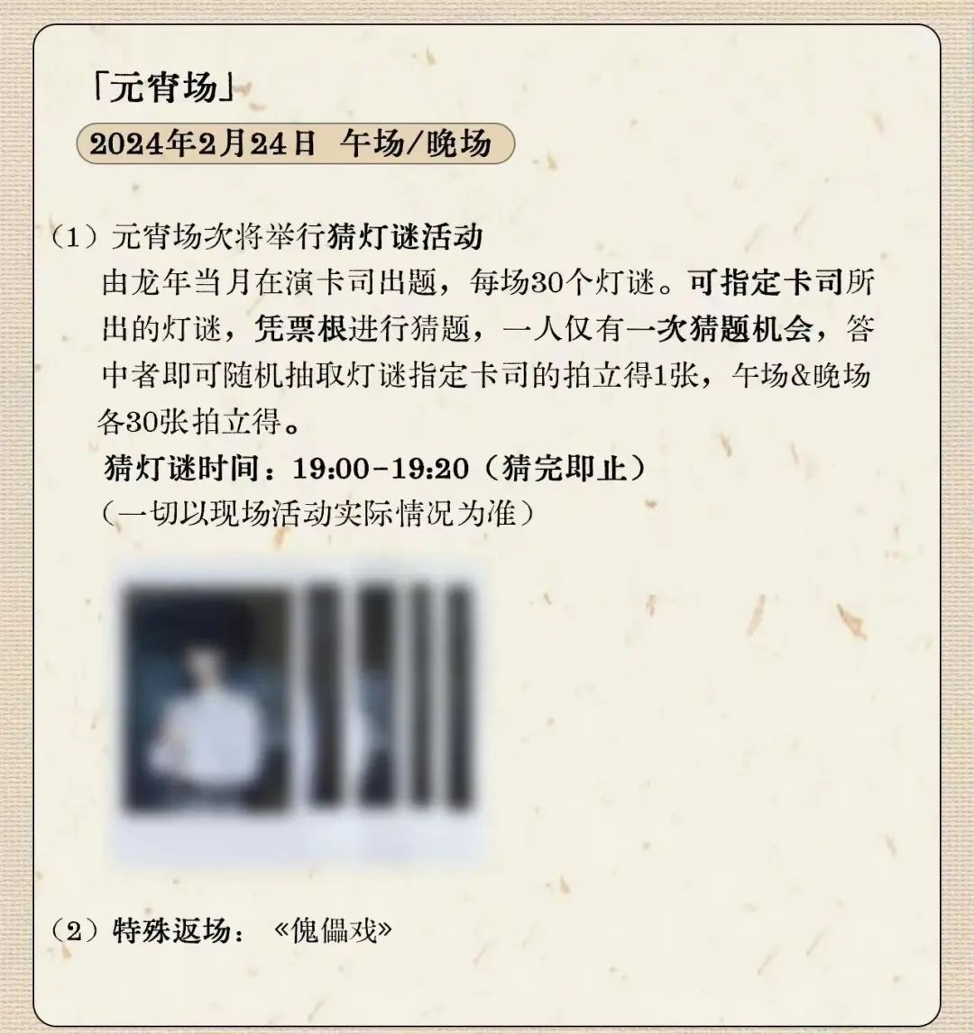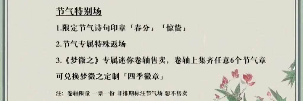 在购票时,小编还发现了主办方用心准备的惊喜小彩蛋:演出当日恰逢24节气的演出场次,将会有节气特殊放场及节气限定周边等你解锁;2月24日元宵节当日,还有民俗活动猜灯谜。更多详细信息,可以移步至魅鲸文化官方微博,了解更多音乐剧《梦微之》特别活动场次的内容。