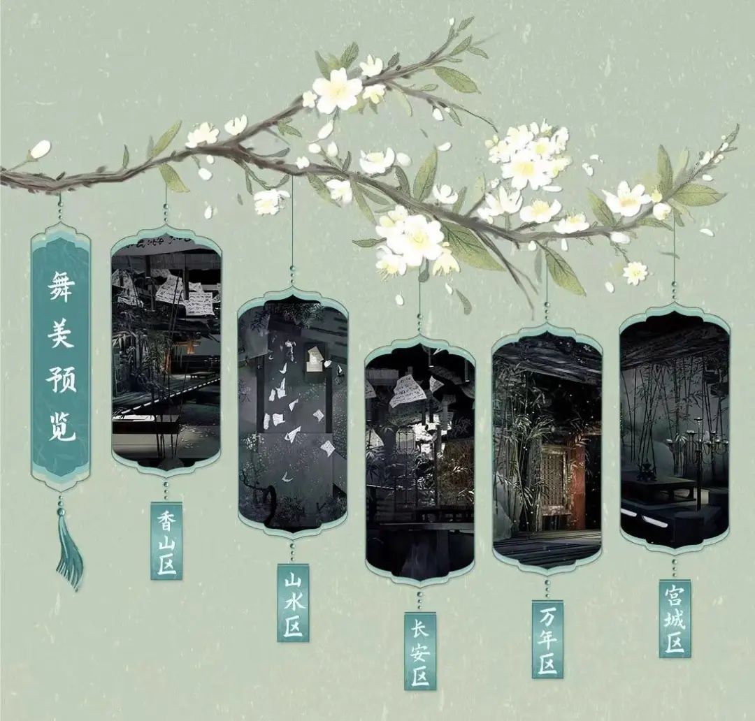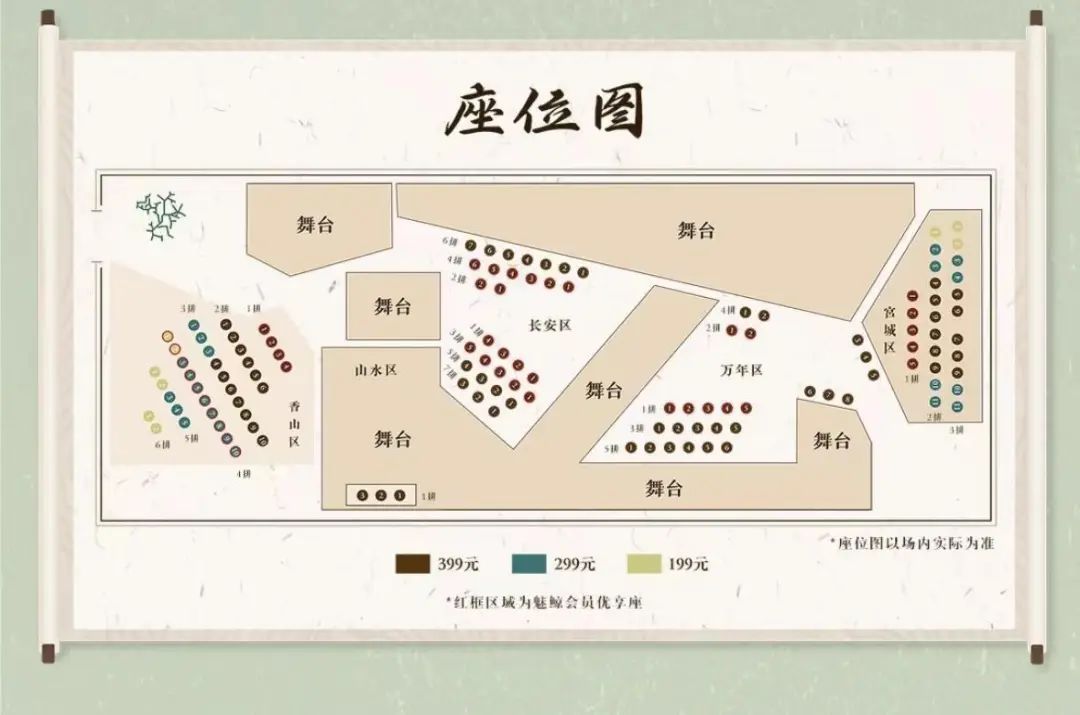 与各中剧场、大剧场票版不同的是,剧场的座位被分割成了香山区、宫城区、山水区和长安区,无处不透露着浓浓古风味道,观众购买不同区域的位置,将会收获到不同的互动体验。是不是更加期待了呢?