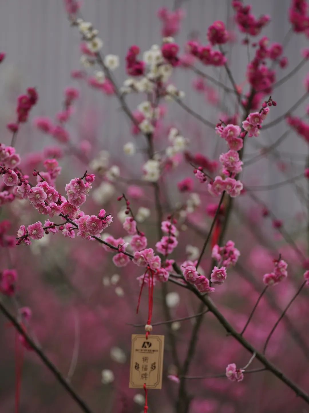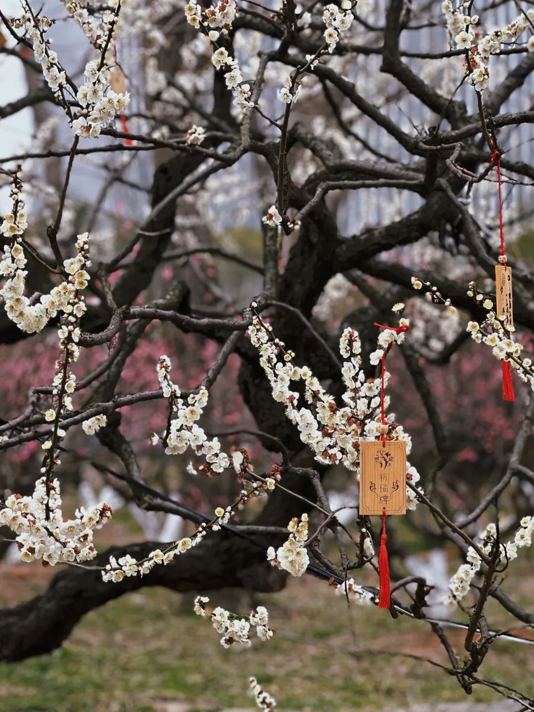 如今,一朵一朵的梅花带着含蓄的暗香,轻巧地绽放在枝头,与园内景致融为一体,暗香丝丝绕绕,落英缤纷,如梦如幻。