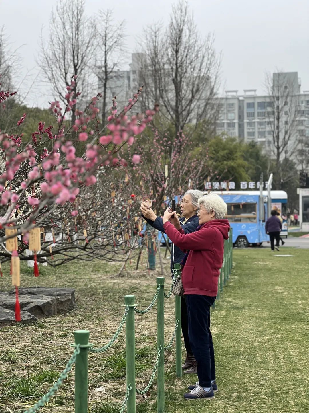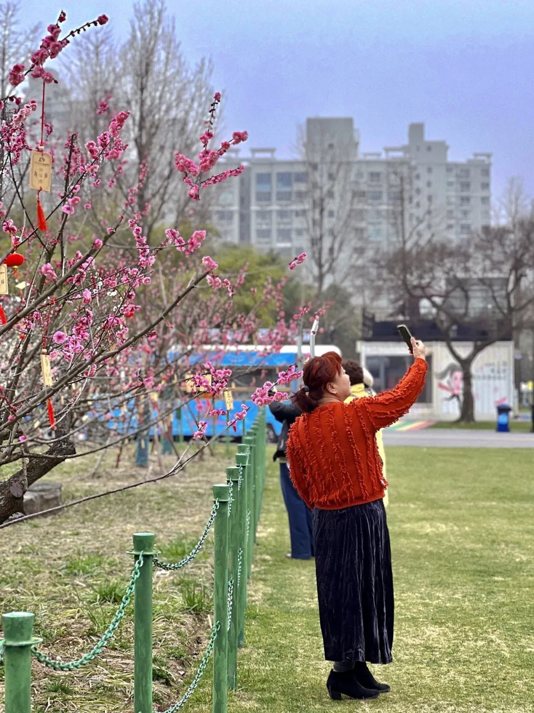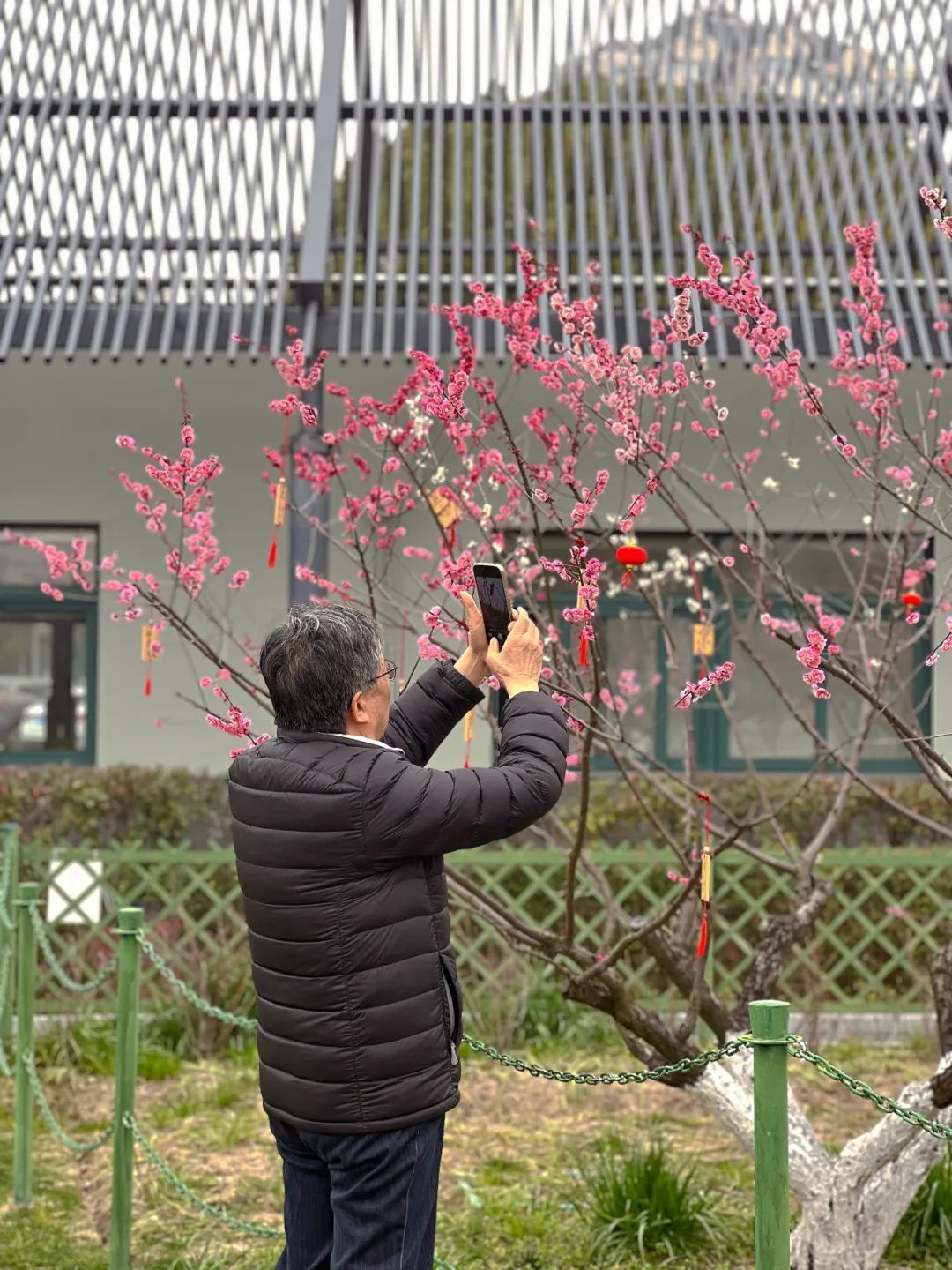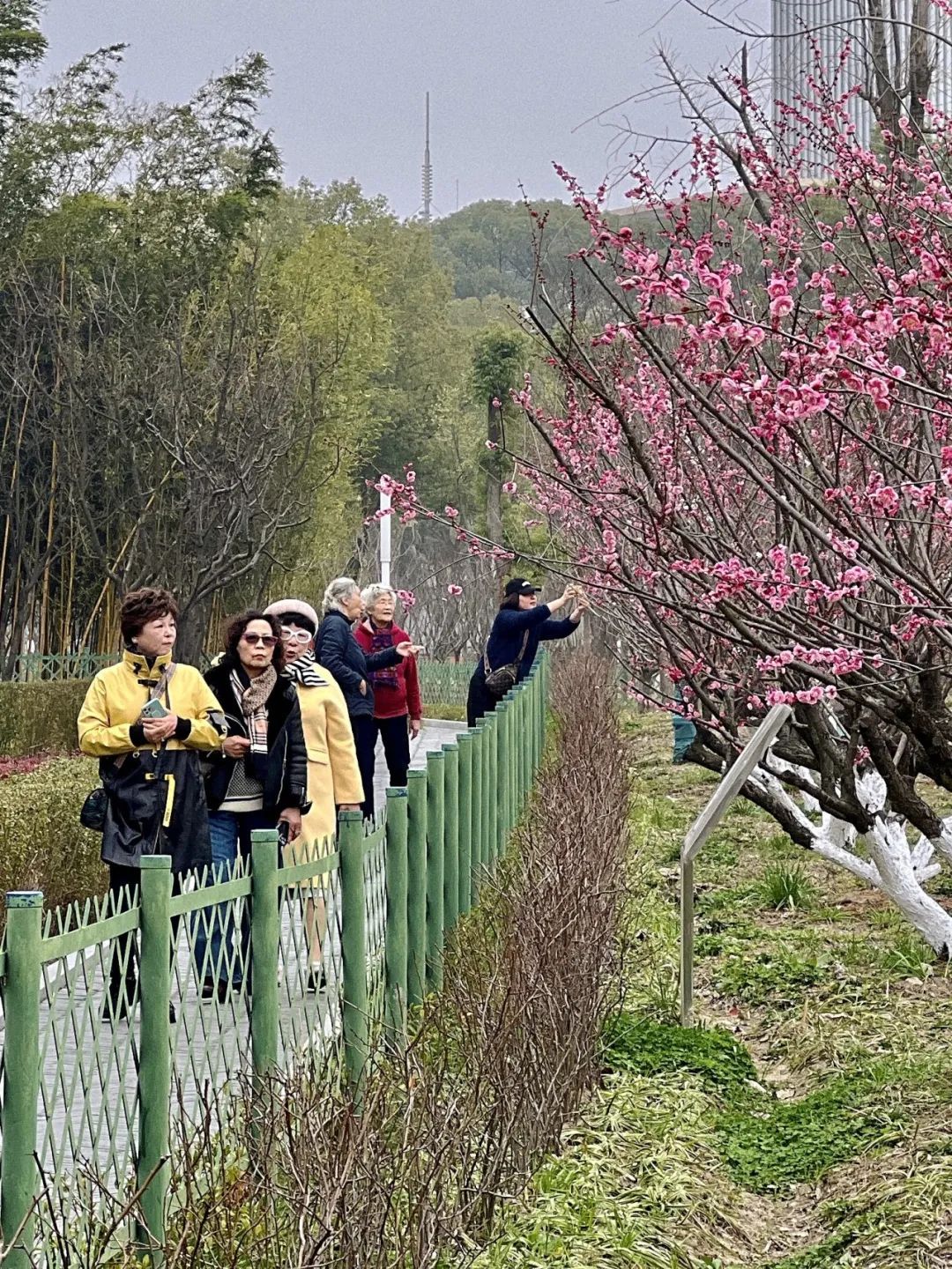 今年开花的时间好像比去年要晚一些,可能跟前段时间气温忽高忽低有关系。”家住外区的孙阿姨特与好友一同前来赏梅,以朵朵梅花作背景,拍照留念。
