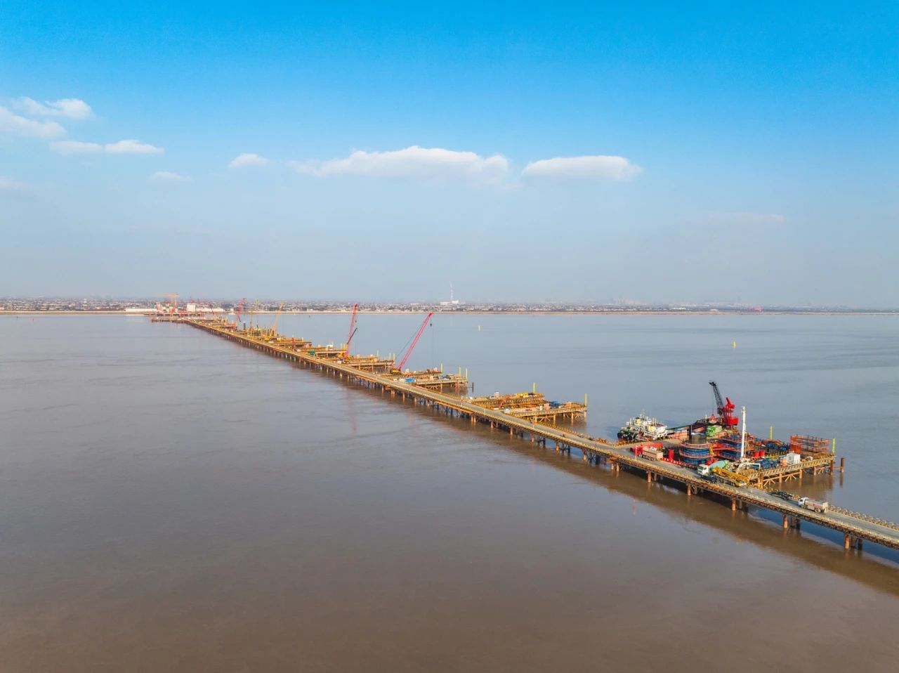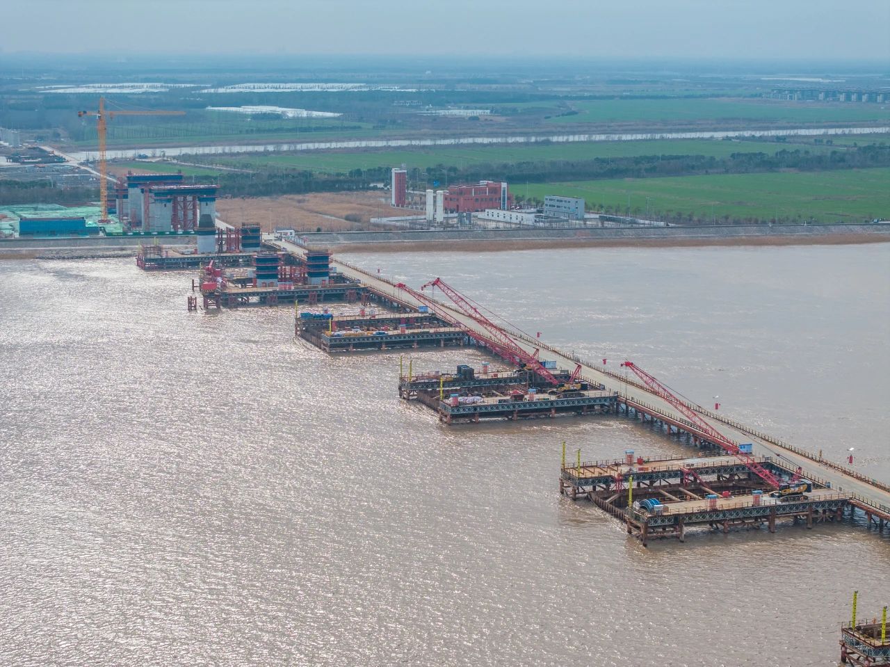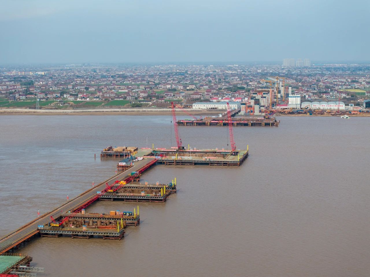 日前,摄影师“飞上”高空,拍摄了一组大桥的建设场景,高空俯瞰,正在建设的崇启公铁长江大桥,犹如一条长龙横卧在浩瀚的长江之上,十分壮观。