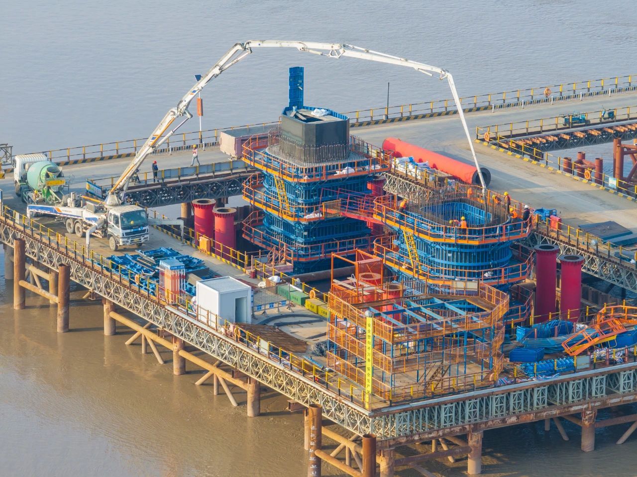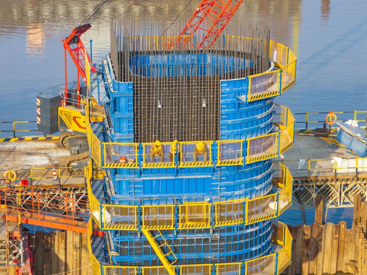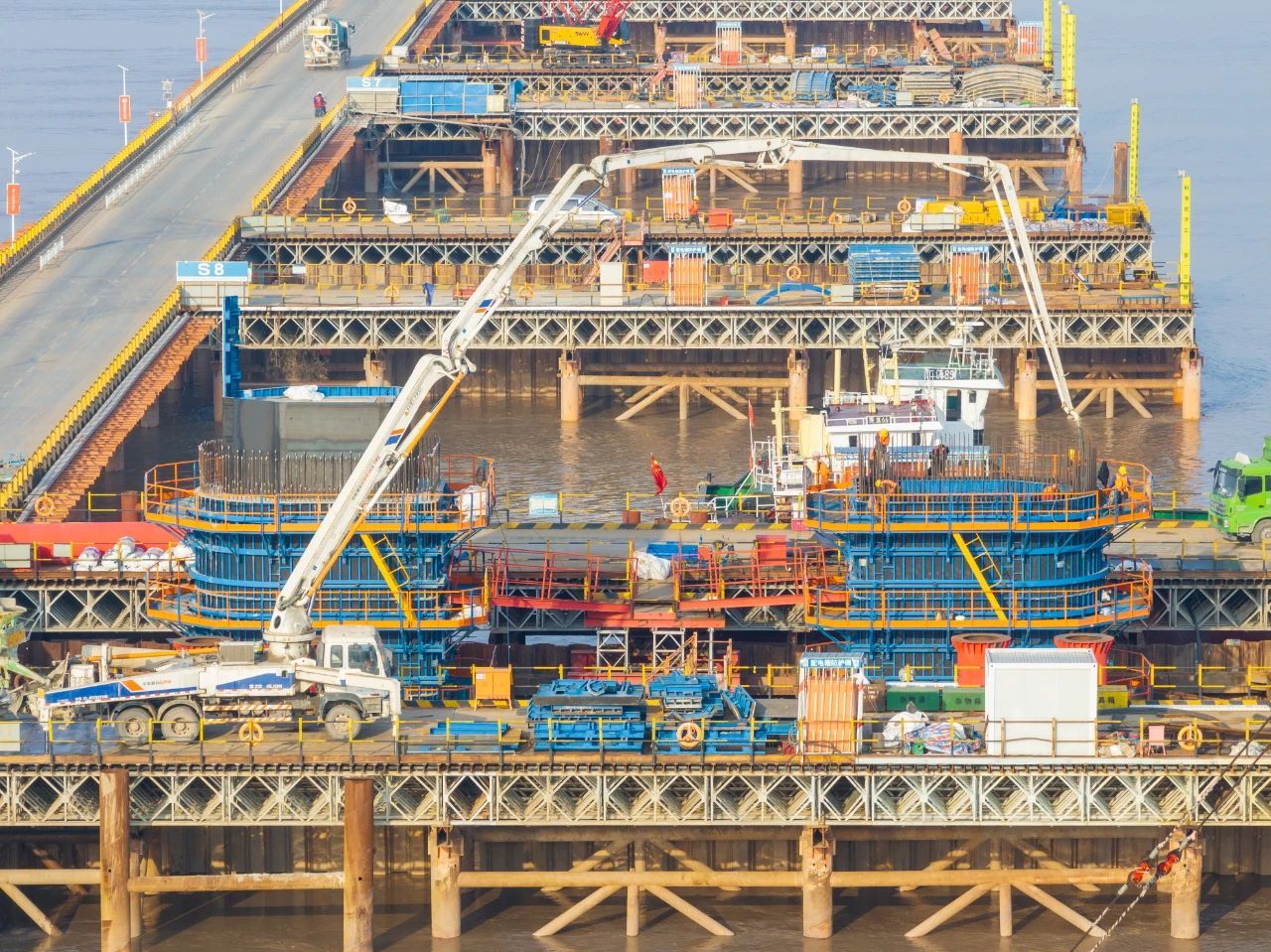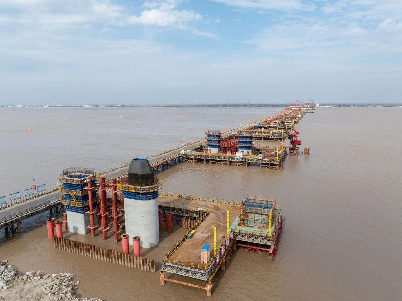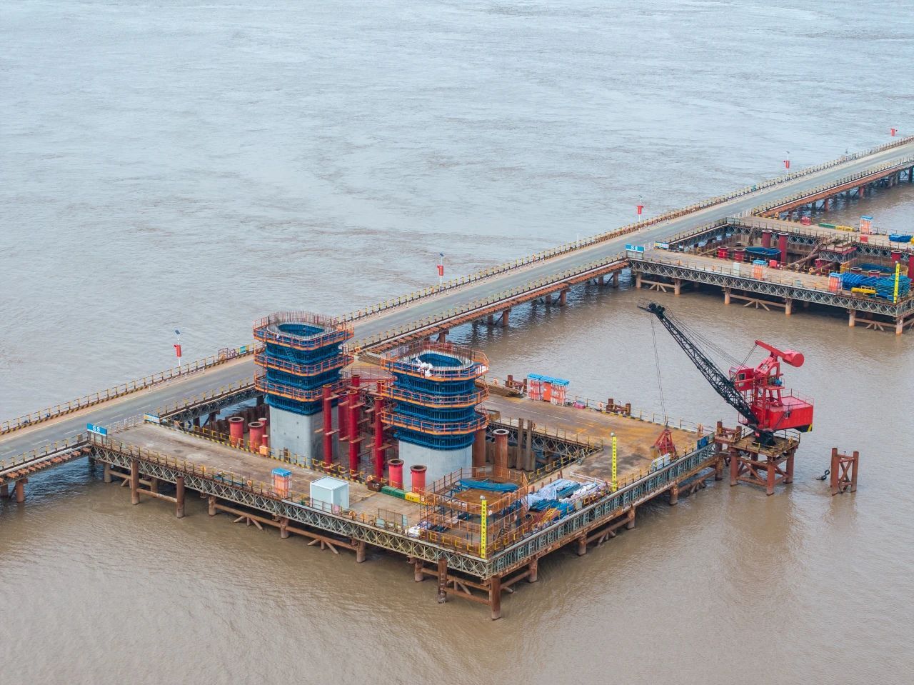 由中铁大桥局承建的世界在建最大跨度双塔双索面公铁两用无砟轨道斜拉桥——崇启公铁长江大桥正在火热建设中。