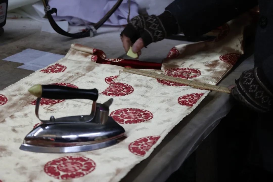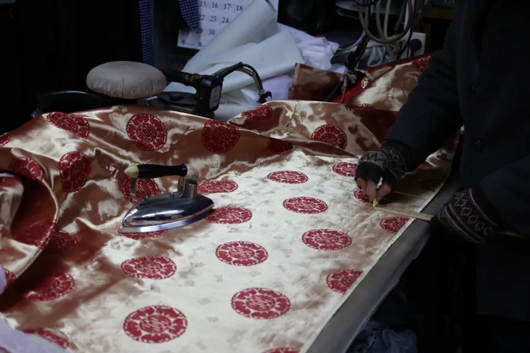 “花纹要在衣服后背正中间。”“无纺布可以让衣领、内衬更硬拔。”说起裁剪制衣,杨则钱眼里闪着热爱的光芒。在杨师傅的巧手下,完成一件衣服通常只需一天。进门时还是简简单单的一块布,不到一小时就在他的手中裁出了前片、后片和门襟。