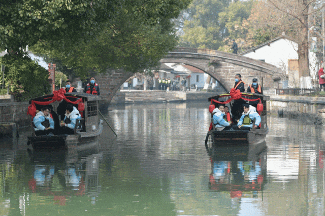 乘坐摇橹船,穿梭于河道间、桥洞下,看一幅古镇水色长卷,一探水乡泽国古往今来的故事,好不惬意。