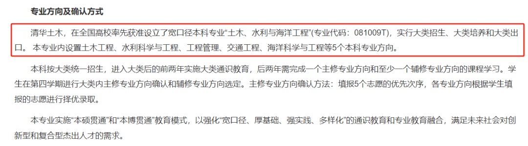 网站称,清华大学在全国高校率先获准设立了宽口径本科专业“土木、水利与海洋工程”,实行大类招生、大类培养和大类出口。网站还介绍了土木大类招生的“专业方向及确认方式”:本科按大类统一招生,进入大类后的前两年实施大类通识教育,后两年需完成一个主修专业方向和至少一个辅修专业方向的课程学习。学生在第四学期进行大类内主修专业方向确认和辅修专业方向选定。主修专业方向确认方法:填报5个志愿的优先次序,各专业方向根据学生填报的志愿进行择优录取。