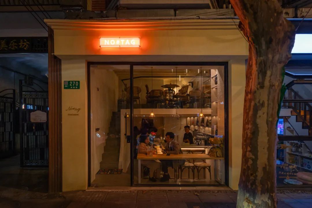 「No#Tag」不停于探索,新店选址南昌路,鹅黄色的沿街小酒馆一眼就能看到。暖色调灯光、动人的音乐和绿植点缀着店铺每一个角落,治愈着每位到店顾客的身心。