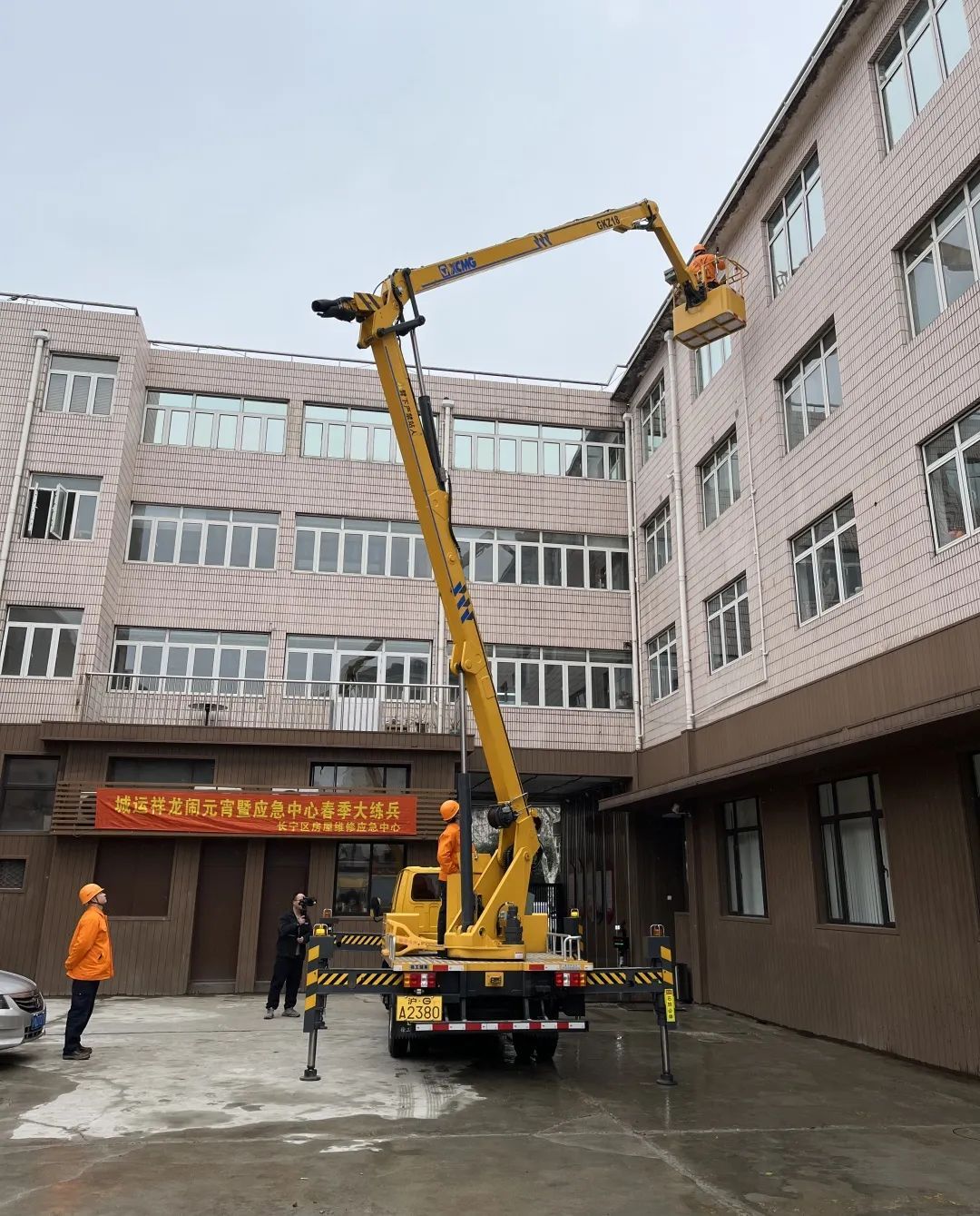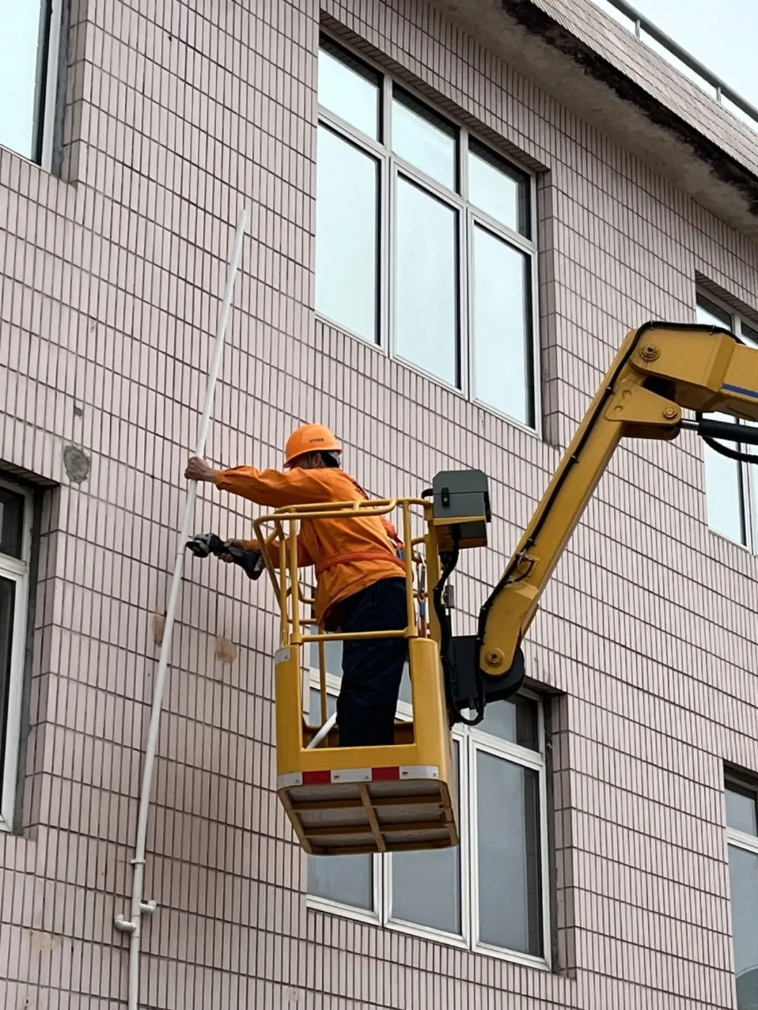 模拟防汛防台期间,房屋外墙雨水管道脱落。在接到通知后,登高车迅速抵达现场,操作员熟练地驾驶着车辆,将工作平台升至脱落水管的高度,维修人员利用专业工具,将脱落的水管部分进行临时固定。接着,维修人员开始拆卸脱落的水管部分,并使用新的水管进行更换。