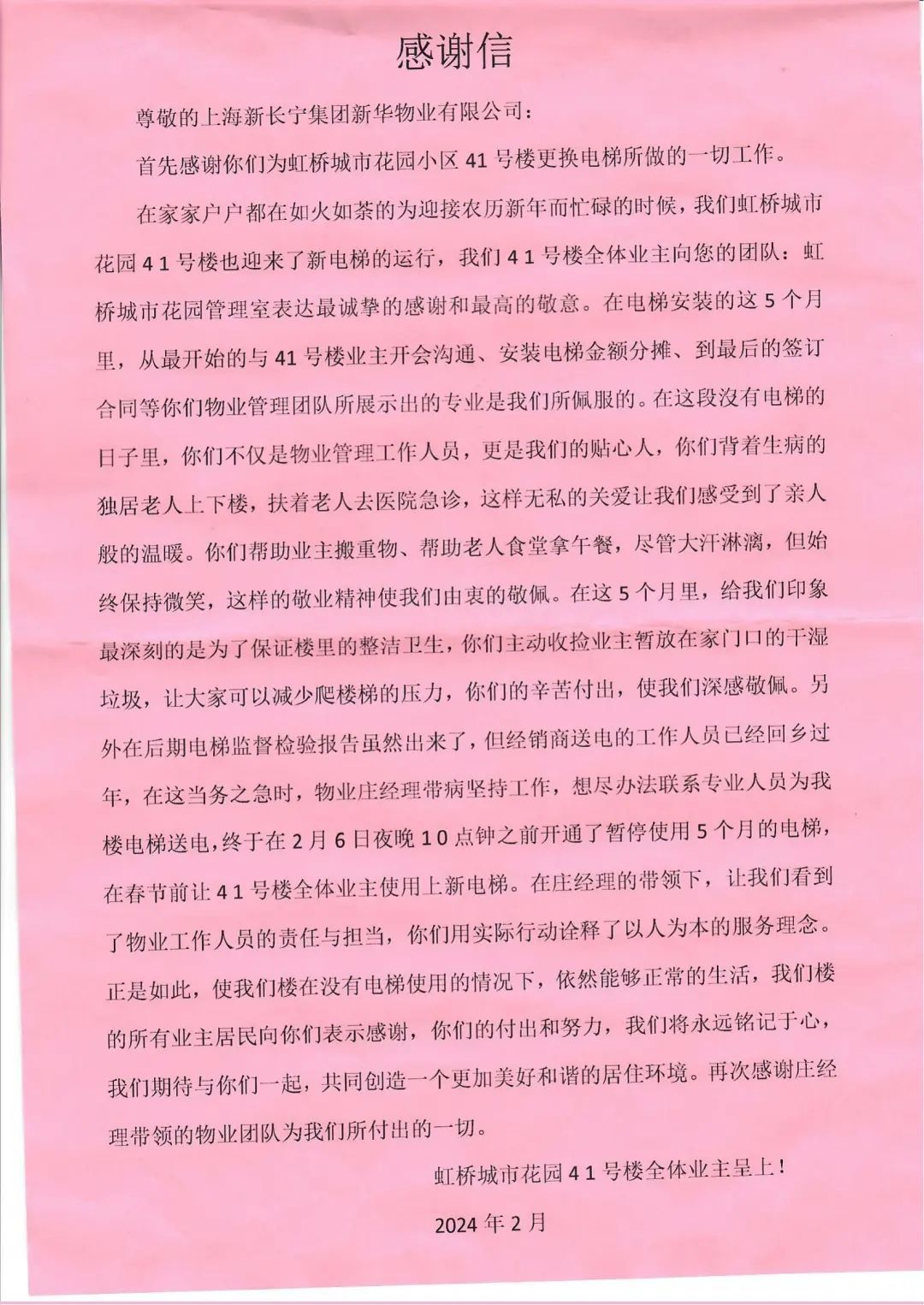 2024年春节前夕,5个月的新梯安装工程接近尾声,电梯的检测报告也已出具,但电梯厂家的送电员工却请假回老家过年了。为了让41号楼居民能赶在春节前使用上新电梯,度过一个欢乐的春节。新华物业虹桥城市花园小区庄经理带病坚持工作,想尽办法联系专业电梯送电人员为新电梯通上了电,赶在春节前让居民们使用上了新电梯。