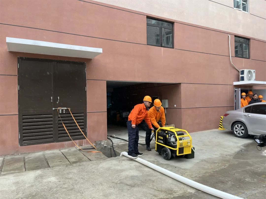 模拟由于暴雨雨势较大,住宅小区地下车库水泵超负荷运转出现故障,导致地下车库开始积水,应急队伍根据原有预案,采用液压动力站链接的雨污泵对车库积水进行抢排,伴着排水泵机的轰鸣,车库积水逐渐排干。