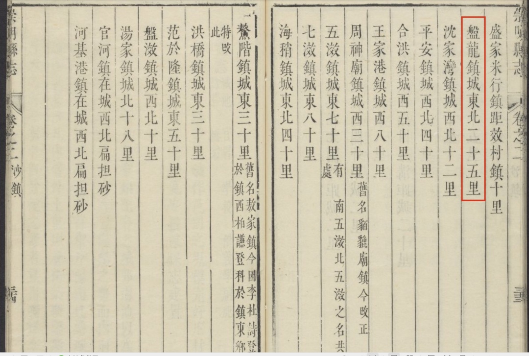 蟠龙镇,现位于建设镇内。该地名最早被记录于清康熙《崇明县志》。在清雍正《崇明县志》上,记者找到了关于蟠龙镇的舆图(地图)标识,当时的蟠龙镇还有南、北之分,根据记载,蟠龙镇位于城东北二十五里。