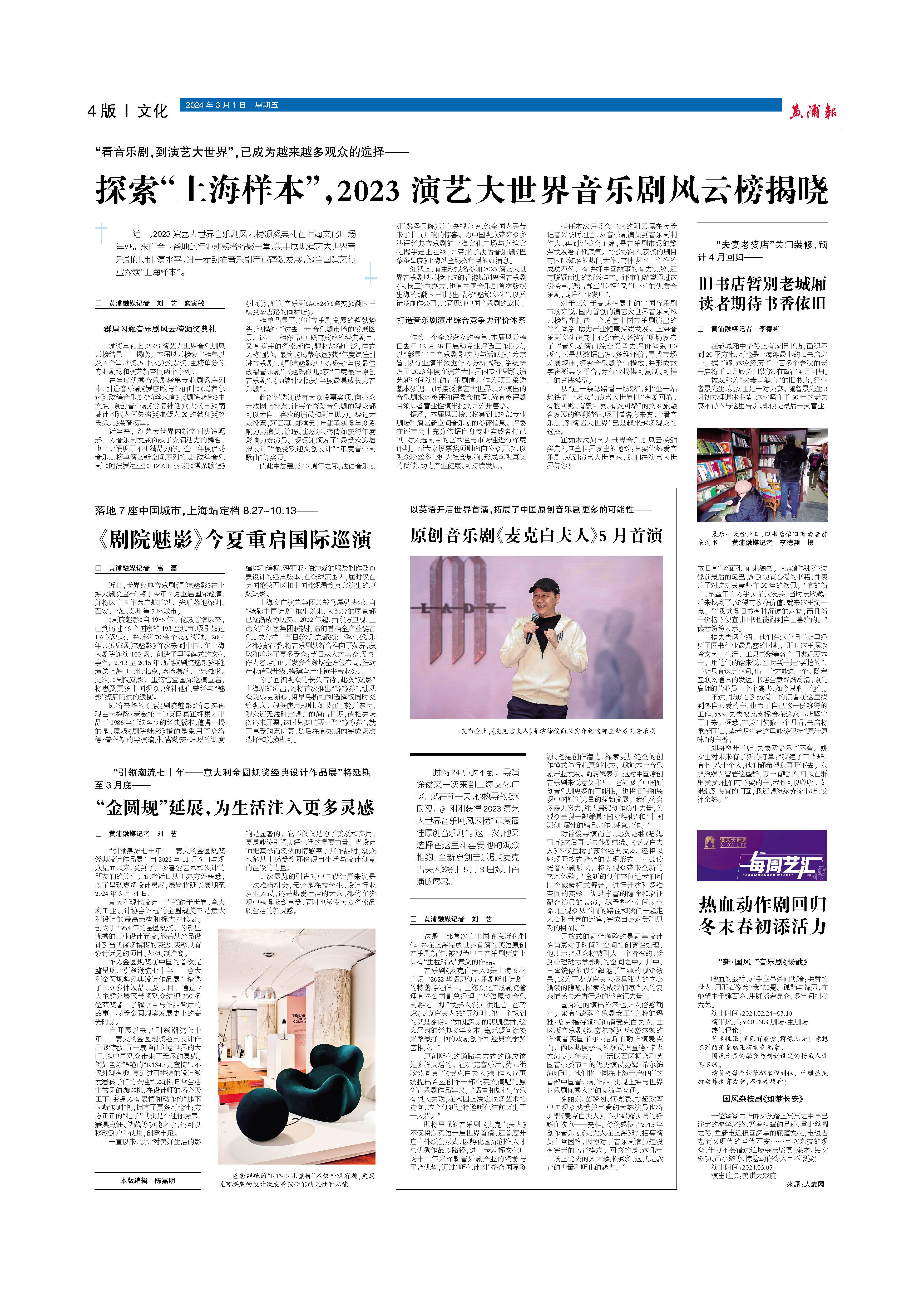 近日,2023演艺大世界音乐剧风云榜颁奖典礼在上海文化广场举办,助推音乐剧产业蓬勃发展,为全国演艺行业探索“上海样本”;世界经典音乐剧《剧院魅影》宣布将于今年7月重启国际巡演,并将以中国作为启航首站,上海站定档8月27日至10月13日;