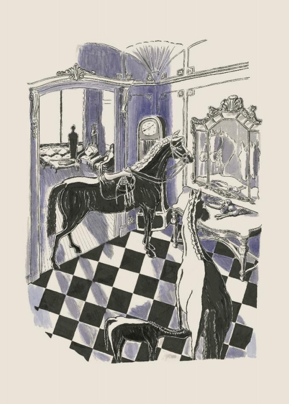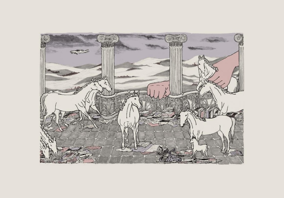 金宇澄曾在“百乐门”静安艺文志专访时提到一幅画的背景,“作协这幅画的背景是作协二楼的一个大阳台。直到有一天人类退出了历史舞台,被动物占领,所以你看作品里面,马是可以吃纸的。里面还有一本书,是我的《繁花》。”再看金宇澄的画作,爱神花园的喷水池、首层入口的门厅、旋转楼梯、二层露台、原主人卧室都曾出现在他的作品画面中。