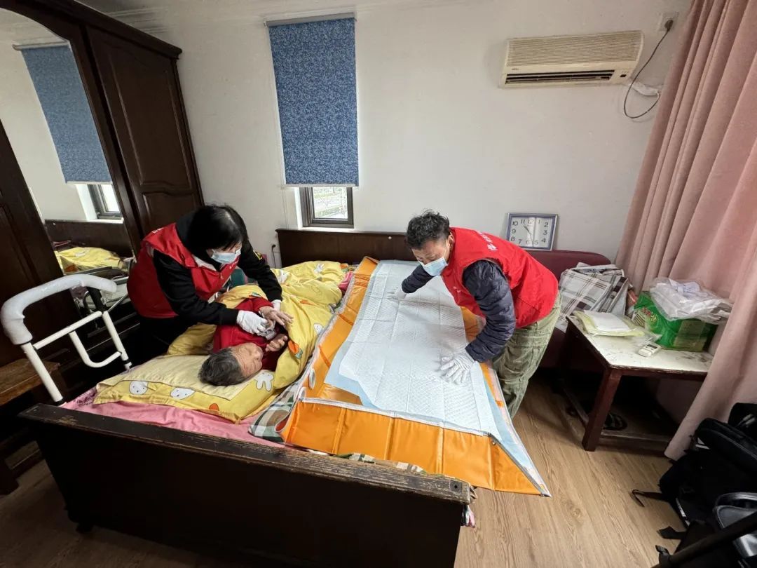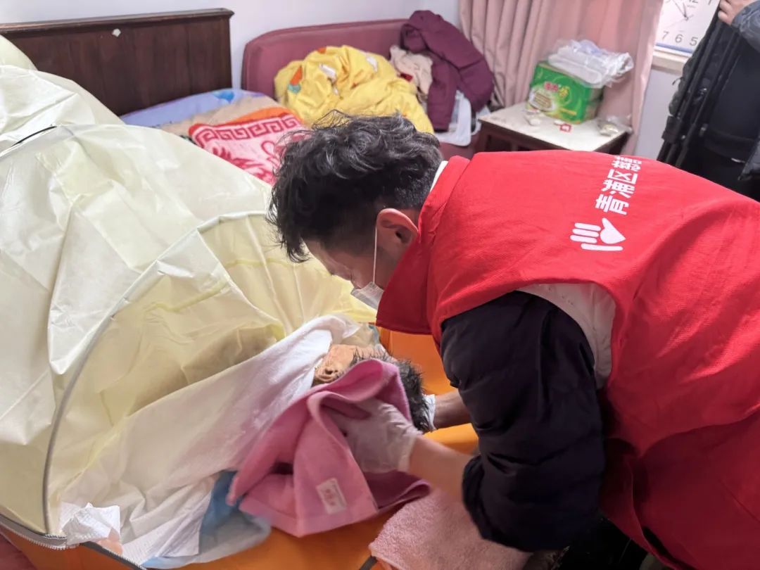 “奶奶,你不用动,我们为您拉上助浴仓,躺着就能洗澡。”上午10点,家住城东新村的徐奶奶在助浴员的帮助下,开始了纳米洗澡。服务开始时,助浴员先将仪器一头的加热棒接入纯净水桶,等待升温期间,她为徐奶奶测量了体温、血压、血氧。确认健康状况适宜洗浴后,家人帮老人侧过身,助浴员则在其身后展开一面无纺布,放上助浴垫,再铺一层隔水垫,之后将老人翻过身置于隔水垫上。助浴员在助浴垫上插入环形支架,再覆盖好定制的洗浴罩形成助浴仓,并在开口处插入感温仪器,徐奶奶便开始了纳米温疗。据助浴员介绍,洗澡前一天,志愿者就会上门对徐奶奶进行评估,了解其身体情况,为老人建立健康档案,在测量血压、体温和脉搏后,确保安全后才开展助浴服务。同时,助浴员也会事先熟悉家中电源、水源位置及空间布局,为老人洗澡做足准备。“与传统助浴服务相比,纳米温疗最大的特点,是可以让老人躺在床上洗澡。大大降低老人从床上到浴室或水盆过程中发生意外伤害的风险,也避免个人隐私长时间暴露的尴尬,让老人洗澡更安全体面。通过温疗,还可以改善长期卧床老人的皮肤问题。助浴仓通过感温监测仪实时关注仓内温度。由于是纳米级的水雾,助浴仓内没有明显的滴水感,只觉身体随着升温开始出汗。而后,随着水雾不断覆盖全身,刷去汗水,起到清洁作用。”助浴员鲍金钢说道。