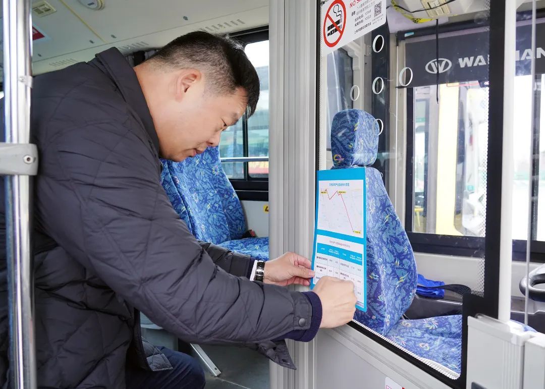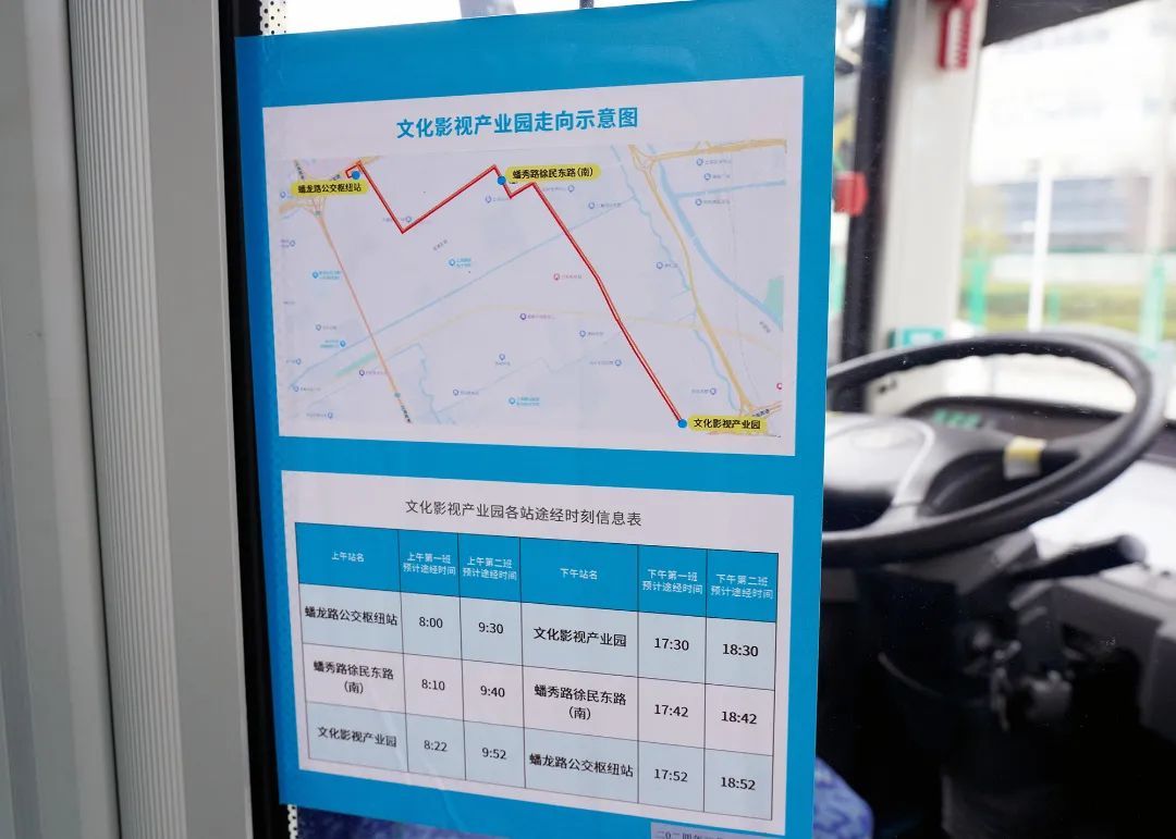 继徐泾镇104产业社区开通地铁17号线蟠龙路站和徐盈路站两条短驳班车后,经过前期征询和现场踏勘后,3月4日,新开通的上海文化影视产业园地铁短驳车线路正式运行。早上9点,离第二班发车还有半小时,京申大众公共交通有限公司相关人员已在站点忙碌开了,粘贴行车走向示意图、摆放班车时刻信息表卡片、开窗开门通风换气……为接下来的运营做着准备工作。