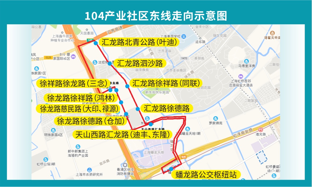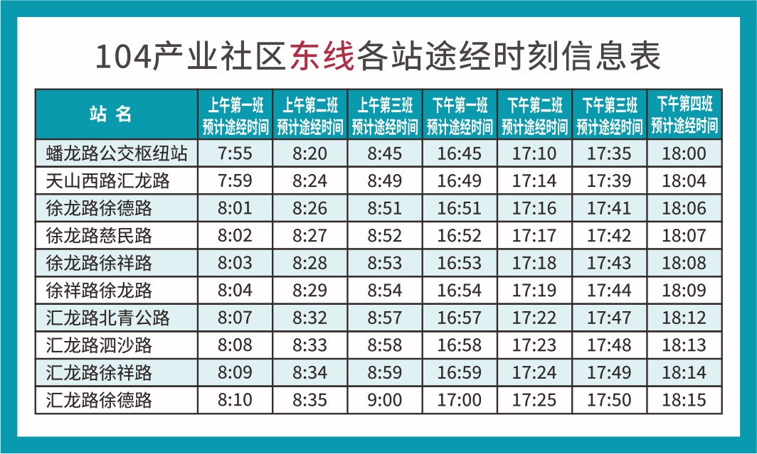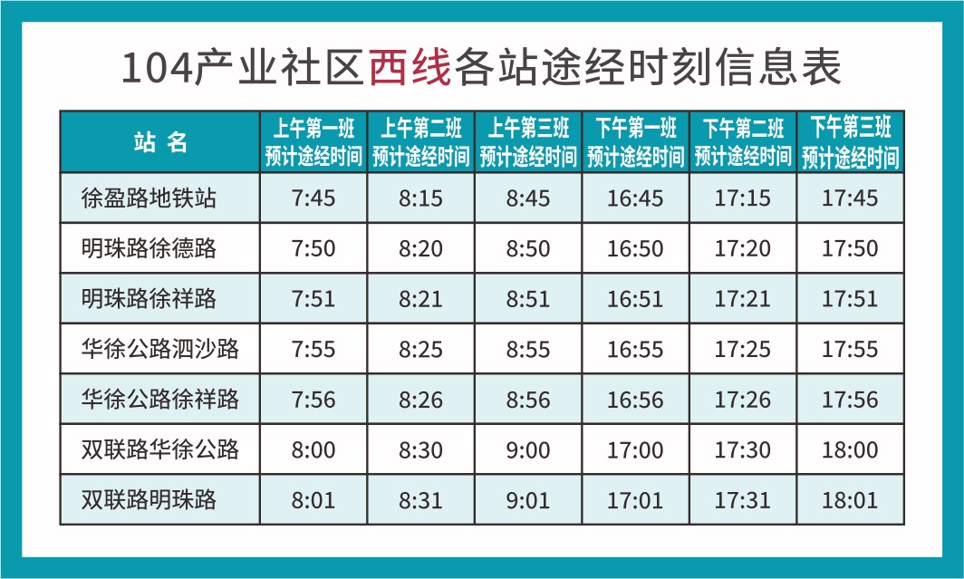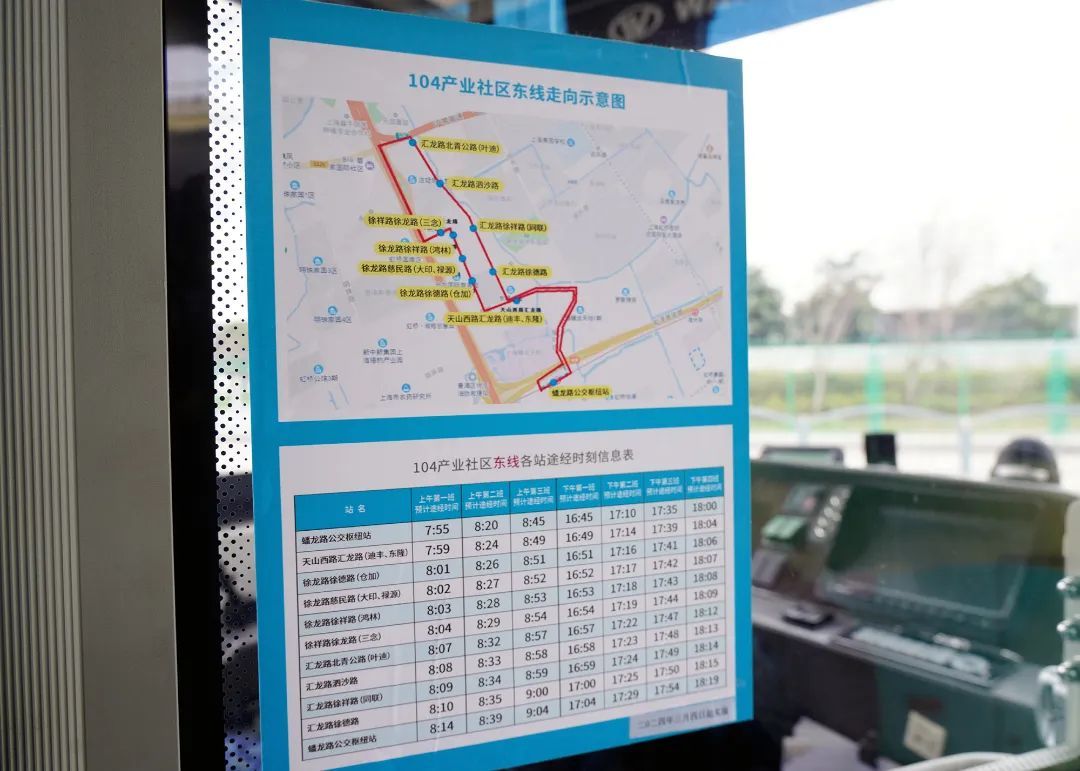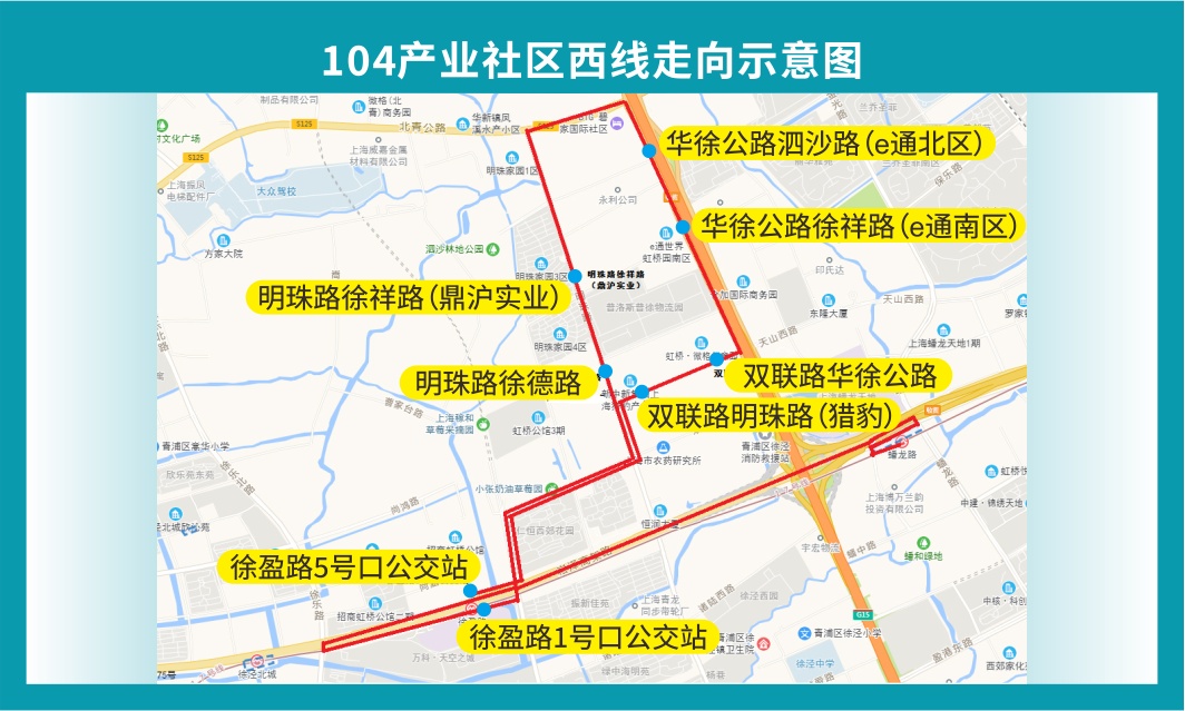 近年来,徐泾镇着力优化营商环境,针对企业和员工的需求,聚焦园区通勤“最后一公里”问题,2022年初为104产业社区开通短驳班车,以沈海高速为界分东、西两条线路,定时定点接送企业员工上下班。东线运营时间为早上7:55、8:20、8:45三个班次,下午16:45、17:10、17:35、18:00四个班次,以蟠龙路公交枢纽为起点,途经天山西路、汇龙路、徐龙路、徐德路、慈民路、徐祥路、北青公路、泗沙路、汇龙路等路段;西线每天早上7:45、8:15、8:45三个班次、下午16:45、17:15、17:45三个班次,以17号线徐盈路地铁站为起点,途经明珠路、徐德路、徐祥路、华徐公路、泗沙路、双联路等路段。